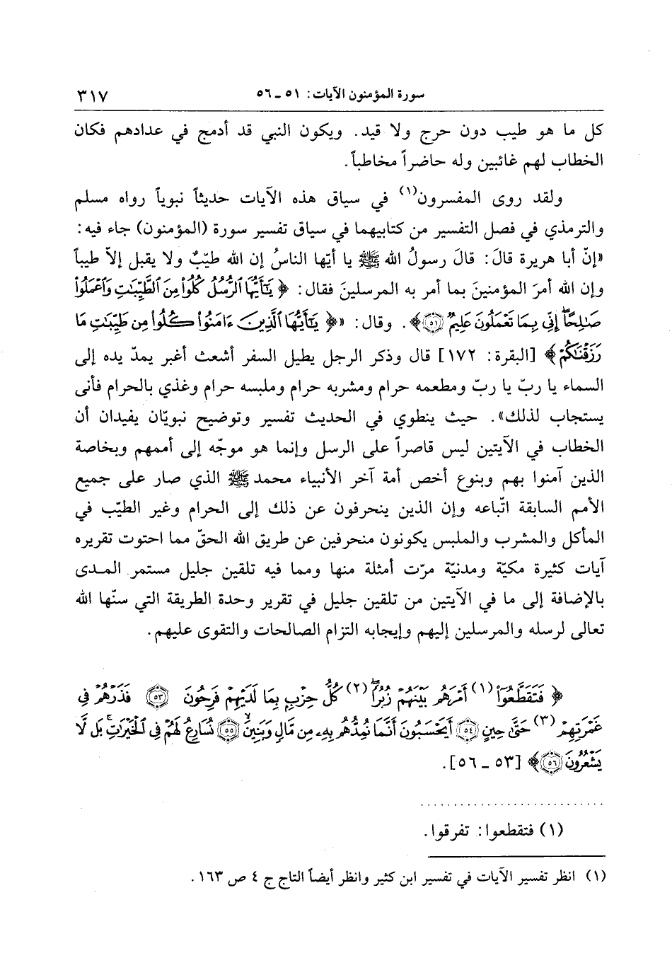 «إنّ أبا هريرة قال: قال رسول الله صلى الله عليه وسلم يا أيّها الناس إن الله طيّب ولا يقبل إلّا طيبا وإنّ الله أمر المؤمنين بما أمر به المرسلين فقال: يا أَيُّهَا الرُّسُلُ كُلُوا مِنَ الطَّيِّباتِ وَاعْمَلُوا صالِحاً إِنِّي بِما تَعْمَلُونَ عَلِيمٌ (51) . وقال: «يا أَيُّهَا الَّذِينَ آمَنُوا كُلُوا مِنْ طَيِّباتِ ما رَزَقْناكُمْ [البقرة: 172] قال وذكر الرجل يطيل السفر أشعث أغبر يمدّ يده إلى السماء يا ربّ يا ربّ ومطعمه حرام ومشربه حرام وملبسه حرام وغذي بالحرام فأنى يستجاب لذلك» . حيث ينطوي في الحديث تفسير وتوضيح نبويّان يفيدان أن الخطاب في الآيتين ليس قاصرا على الرسل وإنما هو موجّه إلى أممهم وبخاصة الذين آمنوا بهم وبنوع أخص أمة آخر الأنبياء محمد صلى الله عليه وسلم الذي صار على جميع الأمم السابقة اتّباعه وإن الذين ينحرفون عن ذلك إلى الحرام وغير الطّيّب في المأكل والمشرب والملبس يكونون منحرفين عن طريق الله الحقّ مما احتوت تقريره آيات كثيرة مكيّة ومدنيّة مرّت أمثلة منها ومما فيه تلقين جليل مستمر المدى بالإضافة إلى ما في الآيتين من تلقين جليل في تقرير وحدة الطريقة التي سنّها الله تعالى لرسله والمرسلين إليهم وإيجابه التزام الصالحات والتقوى عليهم.