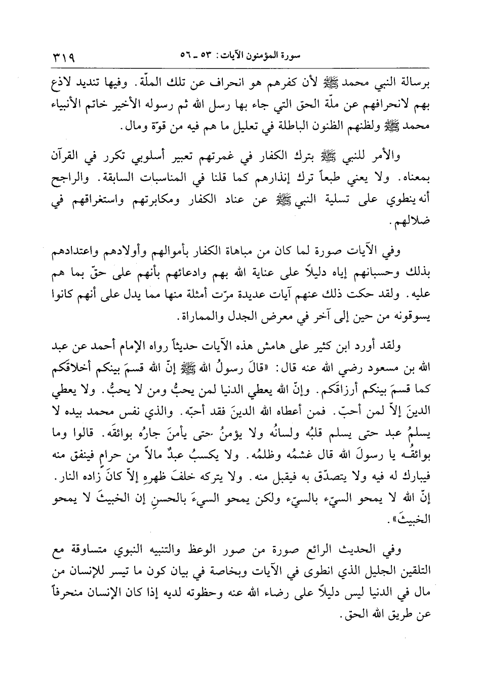 ولقد أورد ابن كثير على هامش هذه الآيات حديثا رواه الإمام أحمد عن عبد الله بن مسعود رضي الله عنه قال: «قال رسول الله صلى الله عليه وسلم إنّ الله قسم بينكم أخلاقكم كما قسم بينكم أرزاقكم. وإنّ الله يعطي الدنيا لمن يحبّ ومن لا يحبّ. ولا يعطي الدين إلّا لمن أحبّ. فمن أعطاه الله الدين فقد أحبّه. والذي نفس محمد بيده لا يسلم عبد حتى يسلم قلبه ولسانه ولا يؤمن حتى يأمن جاره بوائقه. قالوا وما بوائقه يا رسول الله قال غشمه وظلمه. ولا يكسب عبد مالا من حرام فينفق منه فيبارك له فيه ولا يتصدّق به فيقبل منه. ولا يتركه خلف ظهره إلّا كان زاده النار.