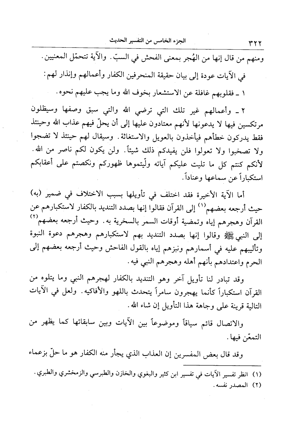 أما الآية الأخيرة فقد اختلف في تأويلها بسبب الاختلاف في ضمير (به) حيث أرجعه بعضهم «1» إلى القرآن فقالوا إنها بصدد التنديد بالكفار لاستكبارهم عن القرآن وهجرهم إياه وتمضية أوقات السمر بالسخرية به. وحيث أرجعه بعضهم «2» إلى النبي صلى الله عليه وسلم وقالوا إنها بصدد التنديد بهم لاستكبارهم وهجرهم دعوة النبوة وتأليبهم عليه في أسمارهم ونبزهم إياه بالقول الفاحش وحيث أرجعه بعضهم إلى الحرم واعتدادهم بأنهم أهله وهجرهم النبي فيه.