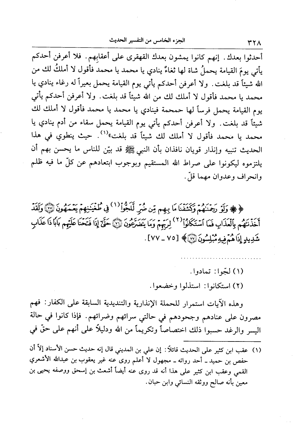 (1) عقب ابن كثير على الحديث قائلا: إن علي بن المديني قال إنه حديث حسن الأسناد إلّا أن حفص بن حميد- أحد رواته- مجهول لا أعلم روى عنه غير يعقوب بن عبد الله الأشعري القمي وعقب ابن كثير على هذا أنه قد روى عنه أيضا أشعث بن إسحق ووصفه يحيى بن معين بأنه صالح ووثقه النسائي وابن حبان.