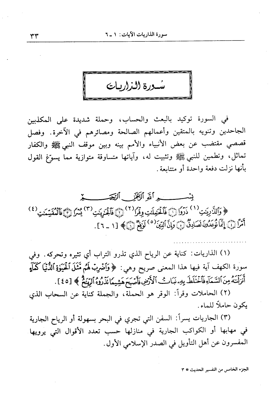 . (1) الذاريات: كناية عن الرياح الذي تذرو التراب أي تثيره وتحركه. وفي سورة الكهف آية فيها هذا المعنى صريح وهي: وَاضْرِبْ لَهُمْ مَثَلَ الْحَياةِ الدُّنْيا كَماءٍ أَنْزَلْناهُ مِنَ السَّماءِ فَاخْتَلَطَ بِهِ نَباتُ الْأَرْضِ فَأَصْبَحَ هَشِيماً تَذْرُوهُ الرِّياحُ [45] .