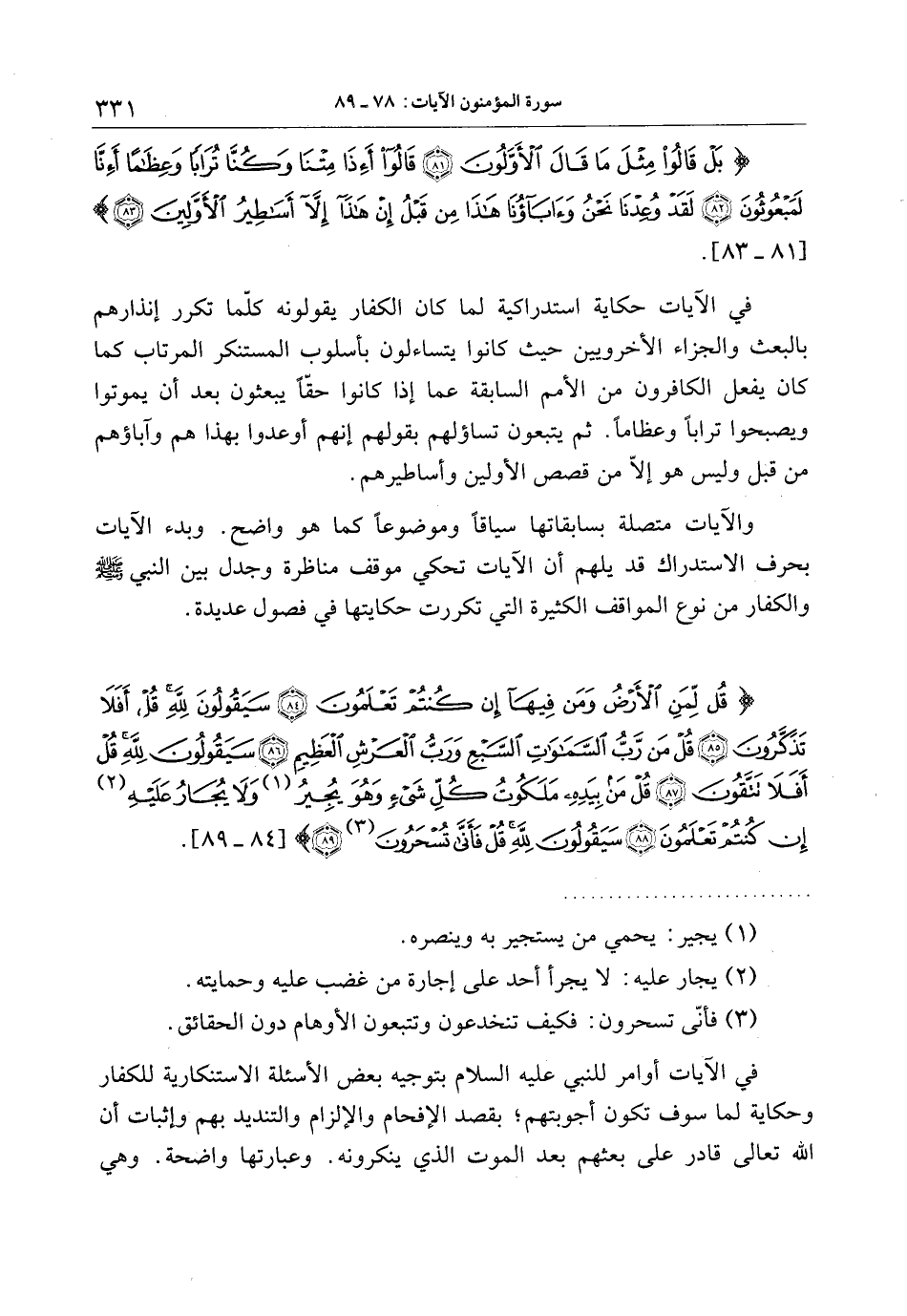 قُلْ لِمَنِ الْأَرْضُ وَمَنْ فِيها إِنْ كُنْتُمْ تَعْلَمُونَ (84) سَيَقُولُونَ لِلَّهِ قُلْ أَفَلا تَذَكَّرُونَ (85) قُلْ مَنْ رَبُّ السَّماواتِ السَّبْعِ وَرَبُّ الْعَرْشِ الْعَظِيمِ (86) سَيَقُولُونَ لِلَّهِ قُلْ أَفَلا تَتَّقُونَ (87) قُلْ مَنْ بِيَدِهِ مَلَكُوتُ كُلِّ شَيْءٍ وَهُوَ يُجِيرُ وَلا يُجارُ عَلَيْهِ إِنْ كُنْتُمْ تَعْلَمُونَ (88)