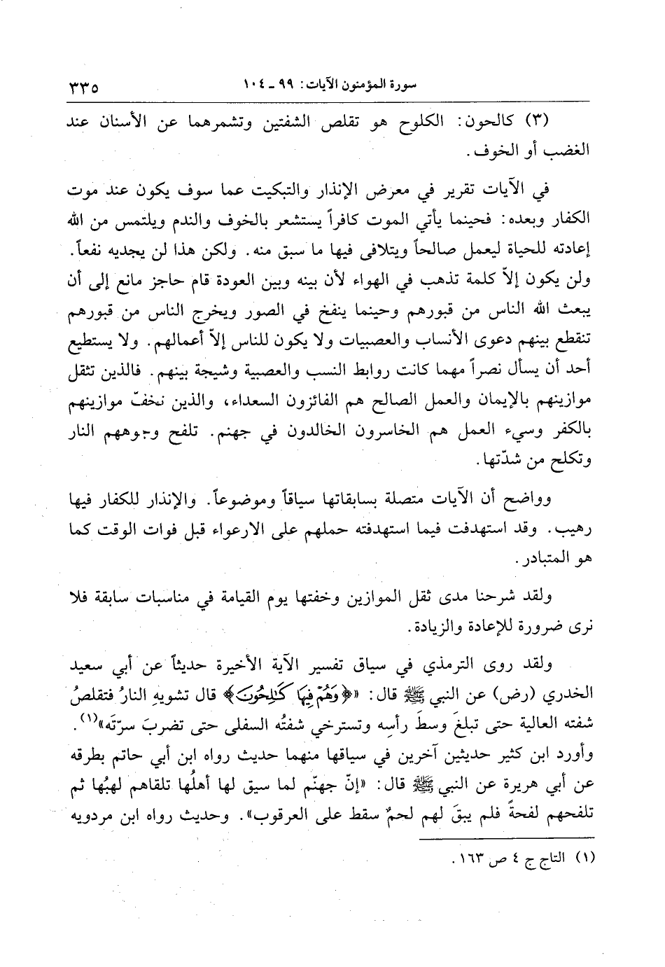 ولقد روى الترمذي في سياق تفسير الآية الأخيرة حديثا عن أبي سعيد الخدري (رض) عن النبي صلى الله عليه وسلم قال: «وَهُمْ فِيها كالِحُونَ قال تشويه النار فتقلص شفته العالية حتى تبلغ وسط رأسه وتسترخي شفته السفلى حتى تضرب سرّته» «1» .