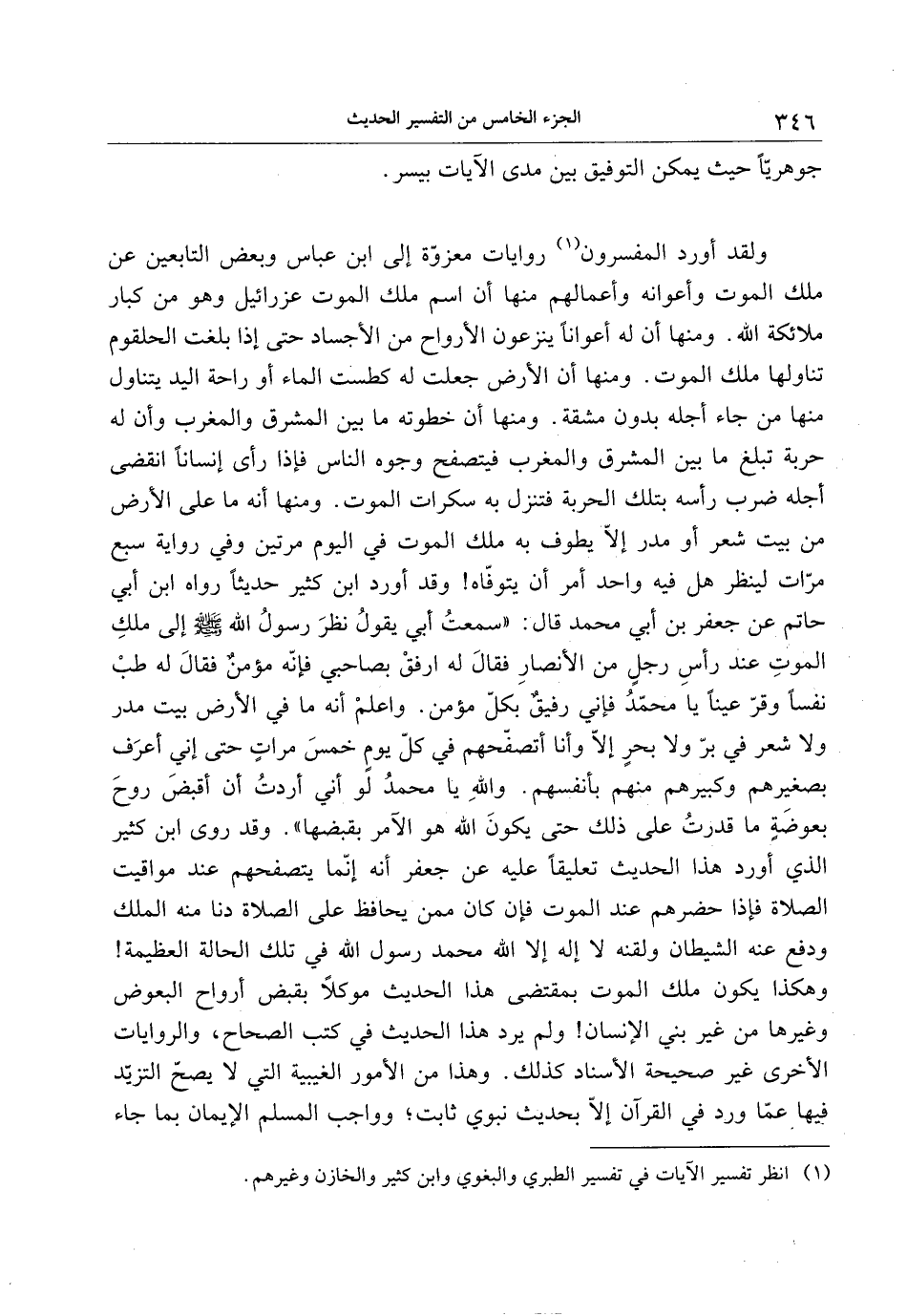 ولقد أورد المفسرون «1» روايات معزوّة إلى ابن عباس وبعض التابعين عن ملك الموت وأعوانه وأعمالهم منها أن اسم ملك الموت عزرائيل وهو من كبار ملائكة الله. ومنها أن له أعوانا ينزعون الأرواح من الأجساد حتى إذا بلغت الحلقوم تناولها ملك الموت. ومنها أن الأرض جعلت له كطست الماء أو راحة اليد يتناول منها من جاء أجله بدون مشقة. ومنها أن خطوته ما بين المشرق والمغرب وأن له حربة تبلغ ما بين المشرق والمغرب فيتصفح وجوه الناس فإذا رأى إنسانا انقضى أجله ضرب رأسه بتلك الحربة فتنزل به سكرات الموت. ومنها أنه ما على الأرض من بيت شعر أو مدر إلّا يطوف به ملك الموت في اليوم مرتين وفي رواية سبع مرّات لينظر هل فيه واحد أمر أن يتوفّاه! وقد أورد ابن كثير حديثا رواه ابن أبي حاتم عن جعفر بن أبي محمد قال: «سمعت أبي يقول نظر رسول الله صلى الله عليه وسلم إلى ملك الموت عند رأس رجل من الأنصار فقال له ارفق بصاحبي فإنّه مؤمن فقال له طب نفسا وقرّ عينا يا محمّد فإني رفيق بكلّ مؤمن. واعلم أنه ما في الأرض بيت مدر ولا شعر في برّ ولا بحر إلّا وأنا أتصفّحهم في كلّ يوم خمس مرات حتى إني أعرف بصغيرهم وكبيرهم منهم بأنفسهم. والله يا محمد لو أني أردت أن أقبض روح بعوضة ما قدرت على ذلك حتى يكون الله هو الآمر بقبضها» . وقد روى ابن كثير الذي أورد هذا الحديث تعليقا عليه عن جعفر أنه إنّما يتصفحهم عند مواقيت الصلاة فإذا حضرهم عند الموت فإن كان ممن يحافظ على الصلاة دنا منه الملك ودفع عنه الشيطان ولقنه لا إله إلا الله محمد رسول الله في تلك الحالة العظيمة! وهكذا يكون ملك الموت بمقتضى هذا الحديث موكلا بقبض أرواح البعوض وغيرها من غير بني الإنسان! ولم يرد هذا الحديث في كتب الصحاح، والروايات الأخرى غير صحيحة الأسناد كذلك. وهذا من الأمور الغيبية التي لا يصحّ التزيّد فيها عمّا ورد في القرآن إلّا بحديث نبوي ثابت وواجب المسلم الإيمان بما جاء