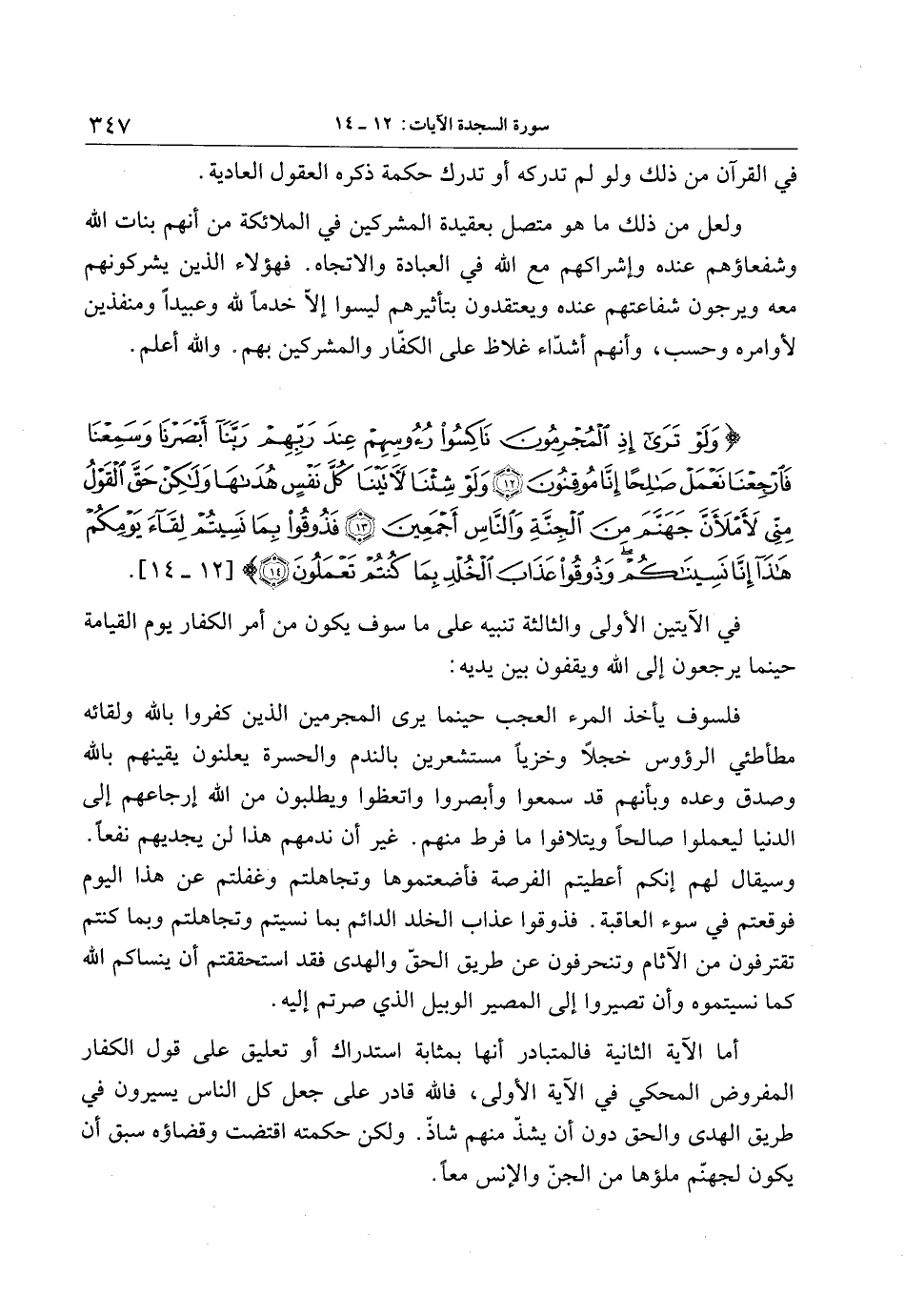 وَلَوْ تَرى إِذِ الْمُجْرِمُونَ ناكِسُوا رُؤُسِهِمْ عِنْدَ رَبِّهِمْ رَبَّنا أَبْصَرْنا وَسَمِعْنا فَارْجِعْنا نَعْمَلْ صالِحاً إِنَّا مُوقِنُونَ (12) وَلَوْ شِئْنا لَآتَيْنا كُلَّ نَفْسٍ هُداها وَلكِنْ حَقَّ الْقَوْلُ مِنِّي لَأَمْلَأَنَّ جَهَنَّمَ مِنَ الْجِنَّةِ وَالنَّاسِ أَجْمَعِينَ (13) فَذُوقُوا بِما نَسِيتُمْ لِقاءَ يَوْمِكُمْ هذا إِنَّا نَسِيناكُمْ وَذُوقُوا عَذابَ الْخُلْدِ بِما كُنْتُمْ تَعْمَلُونَ (14)