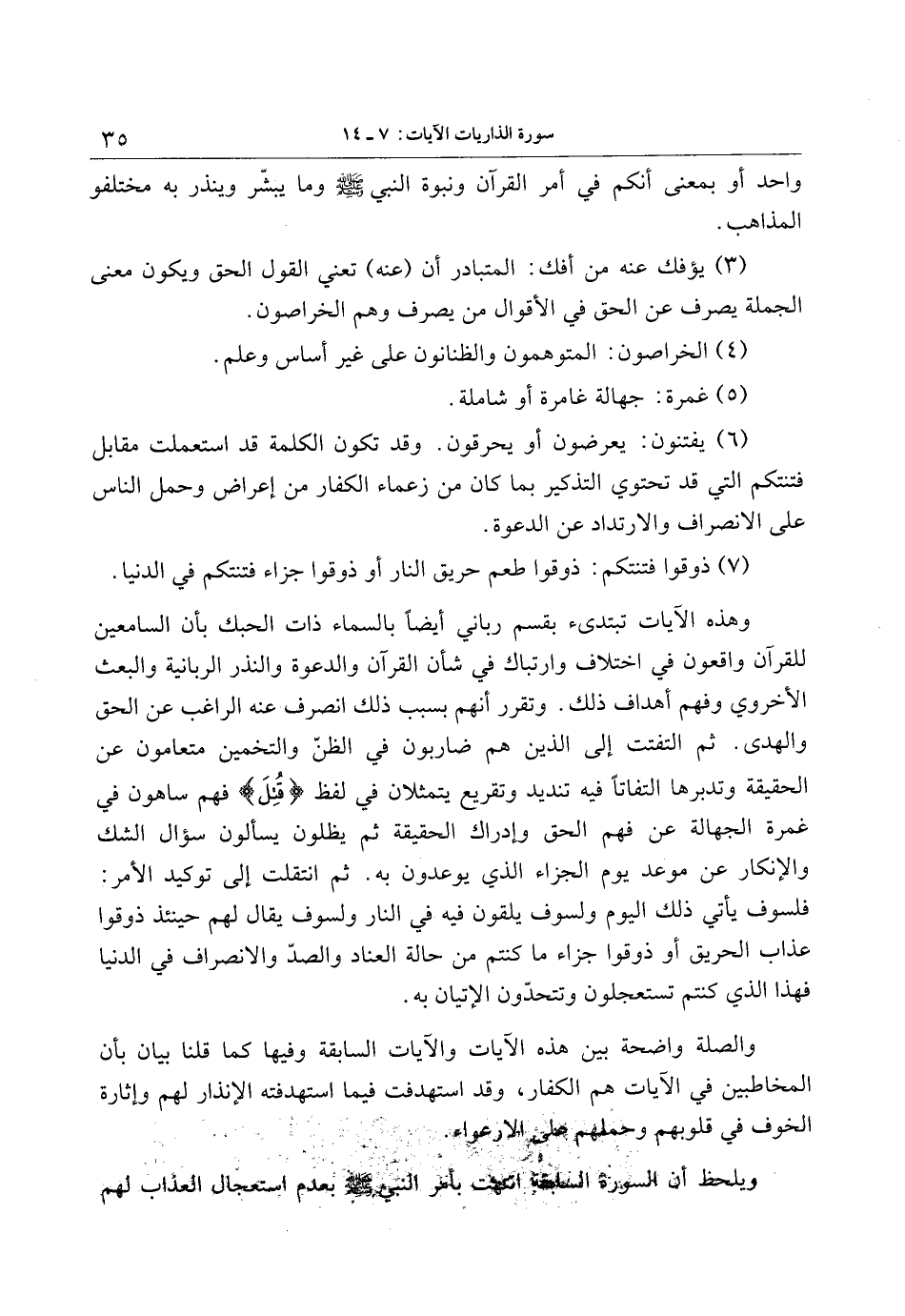 وهذه الآيات تبتدئ بقسم رباني أيضا بالسماء ذات الحبك بأن السامعين للقرآن واقعون في اختلاف وارتباك في شأن القرآن والدعوة والنذر الربانية والبعث الأخروي وفهم أهداف ذلك. وتقرر أنهم بسبب ذلك انصرف عنه الراغب عن الحق والهدى. ثم التفتت إلى الذين هم ضاربون في الظنّ والتخمين متعامون عن الحقيقة وتدبرها التفاتا فيه تنديد وتقريع يتمثلان في لفظ قُتِلَ فهم ساهون في غمرة الجهالة عن فهم الحق وإدراك الحقيقة ثم يظلون يسألون سؤال الشك والإنكار عن موعد يوم الجزاء الذي يوعدون به. ثم انتقلت إلى توكيد الأمر: