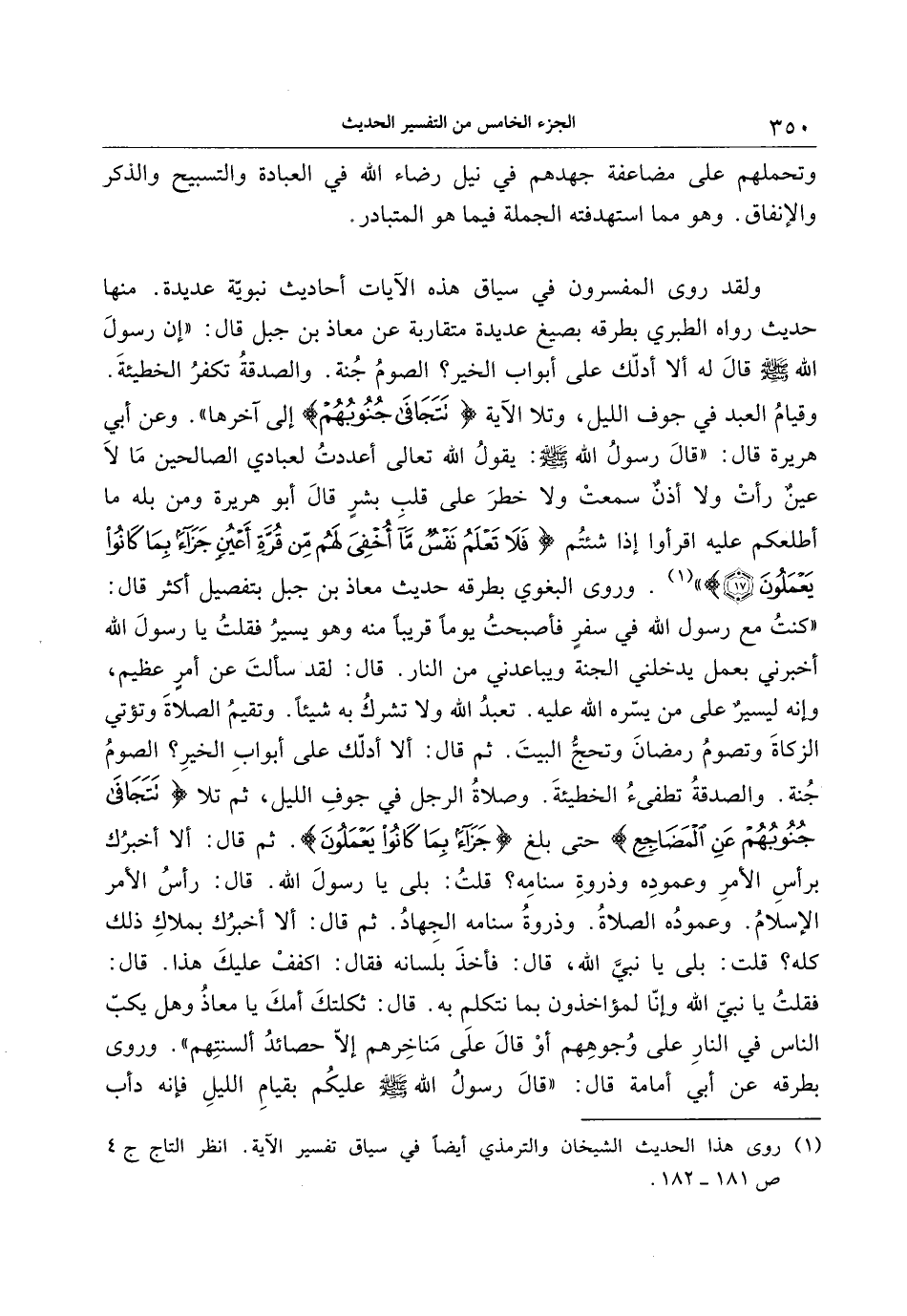«كنت مع رسول الله في سفر فأصبحت يوما قريبا منه وهو يسير فقلت يا رسول الله أخبرني بعمل يدخلني الجنة ويباعدني من النار. قال: لقد سألت عن أمر عظيم، وإنه ليسير على من يسّره الله عليه. تعبد الله ولا تشرك به شيئا. وتقيم الصلاة وتؤتي الزكاة وتصوم رمضان وتحجّ البيت. ثم قال: ألا أدلّك على أبواب الخير؟ الصوم جنة. والصدقة تطفئ الخطيئة. وصلاة الرجل في جوف الليل، ثم تلا تَتَجافى جُنُوبُهُمْ عَنِ الْمَضاجِعِ حتى بلغ جَزاءً بِما كانُوا يَعْمَلُونَ. ثم قال: ألا أخبرك برأس الأمر وعموده وذروة سنامه؟ قلت: بلى يا رسول الله. قال: رأس الأمر الإسلام. وعموده الصلاة. وذروة سنامه الجهاد. ثم قال: ألا أخبرك بملاك ذلك كله؟ قلت: بلى يا نبيّ الله، قال: فأخذ بلسانه فقال: اكفف عليك هذا. قال: