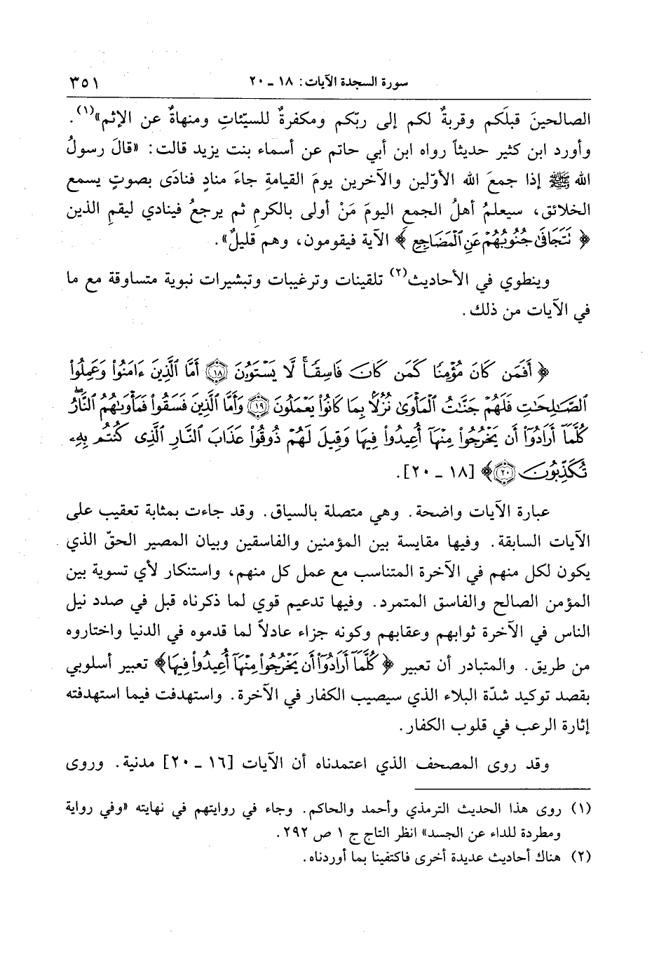 . عبارة الآيات واضحة. وهي متصلة بالسياق. وقد جاءت بمثابة تعقيب على الآيات السابقة. وفيها مقايسة بين المؤمنين والفاسقين وبيان المصير الحقّ الذي يكون لكل منهم في الآخرة المتناسب مع عمل كل منهم، واستنكار لأي تسوية بين المؤمن الصالح والفاسق المتمرد. وفيها تدعيم قوي لما ذكرناه قبل في صدد نيل الناس في الآخرة ثوابهم وعقابهم وكونه جزاء عادلا لما قدموه في الدنيا واختاروه من طريق. والمتبادر أن تعبير كُلَّما أَرادُوا أَنْ يَخْرُجُوا مِنْها أُعِيدُوا فِيها تعبير أسلوبي بقصد توكيد شدّة البلاء الذي سيصيب الكفار في الآخرة. واستهدفت فيما استهدفته إثارة الرعب في قلوب الكفار.