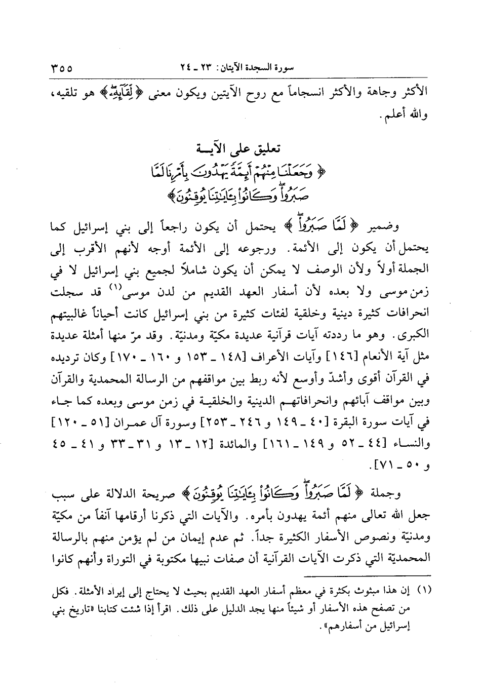 وجملة لَمَّا صَبَرُوا وَكانُوا بِآياتِنا يُوقِنُونَ صريحة الدلالة على سبب جعل الله تعالى منهم أئمة يهدون بأمره. والآيات التي ذكرنا أرقامها آنفا من مكيّة ومدنيّة ونصوص الأسفار الكثيرة جدا. ثم عدم إيمان من لم يؤمن منهم بالرسالة المحمديّة التي ذكرت الآيات القرآنية أن صفات نبيها مكتوبة في التوراة وأنهم كانوا