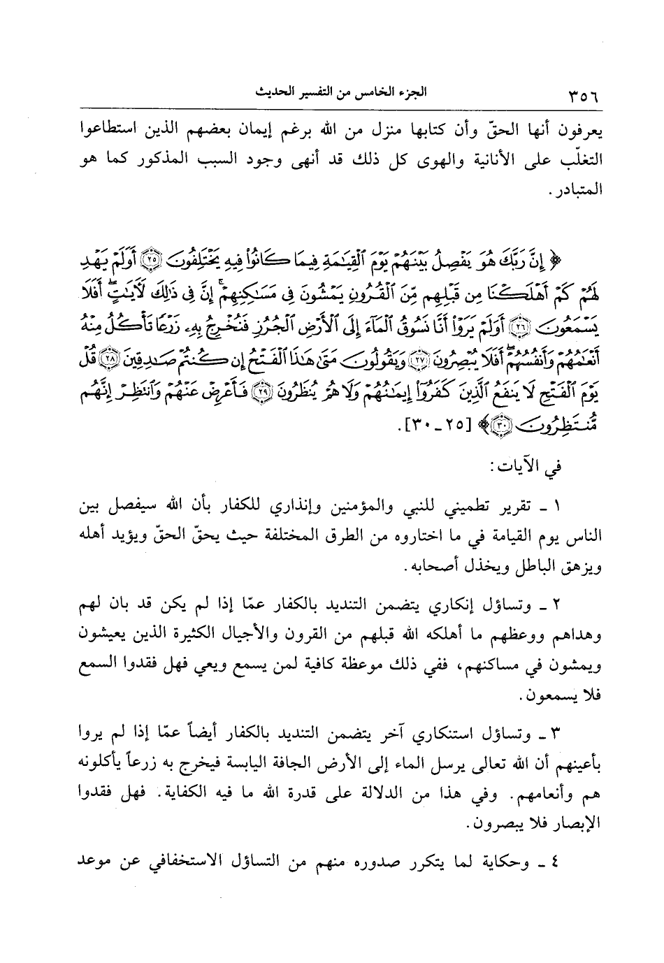 إِنَّ رَبَّكَ هُوَ يَفْصِلُ بَيْنَهُمْ يَوْمَ الْقِيامَةِ فِيما كانُوا فِيهِ يَخْتَلِفُونَ (25) أَوَلَمْ يَهْدِ لَهُمْ كَمْ أَهْلَكْنا مِنْ قَبْلِهِمْ مِنَ الْقُرُونِ يَمْشُونَ فِي مَساكِنِهِمْ إِنَّ فِي ذلِكَ لَآياتٍ أَفَلا يَسْمَعُونَ (26) أَوَلَمْ يَرَوْا أَنَّا نَسُوقُ الْماءَ إِلَى الْأَرْضِ الْجُرُزِ فَنُخْرِجُ بِهِ زَرْعاً تَأْكُلُ مِنْهُ أَنْعامُهُمْ وَأَنْفُسُهُمْ أَفَلا يُبْصِرُونَ (27) وَيَقُولُونَ مَتى هذَا الْفَتْحُ إِنْ كُنْتُمْ صادِقِينَ (28) قُلْ يَوْمَ الْفَتْحِ لا يَنْفَعُ الَّذِينَ كَفَرُوا إِيمانُهُمْ وَلا هُمْ يُنْظَرُونَ (29)