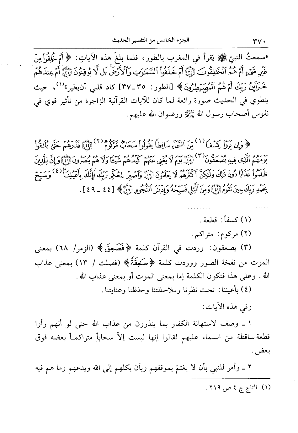 (3) يصعقون: وردت في القرآن كلمة فَصَعِقَ (الزمر/ 68) بمعنى الموت من نفخة الصور ووردت كلمة صاعِقَةً (فصلت/ 13) بمعنى عذاب الله. وعلى هذا فتكون الكلمة إما بمعنى الموت أو بمعنى عذاب الله.