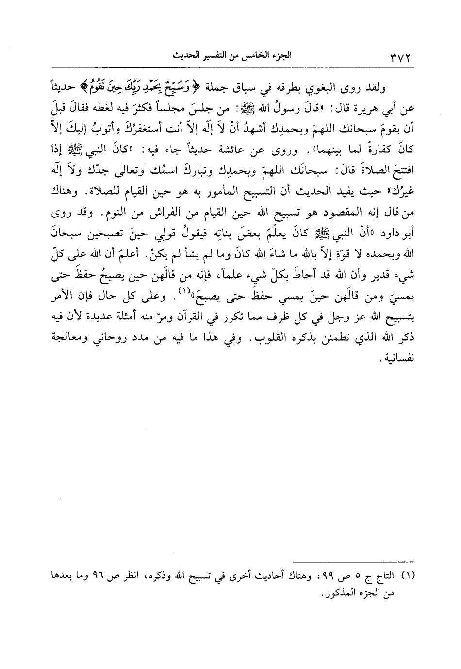 (1) التاج ج 5 ص 99، وهناك أحاديث أخرى في تسبيح الله وذكره، انظر ص 96 وما بعدها من الجزء المذكور.
