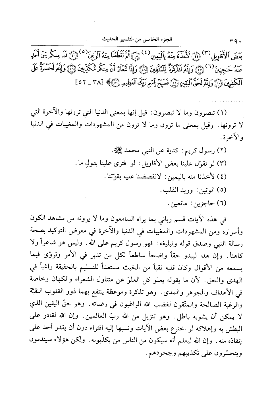 في هذه الآيات قسم رباني بما يراه السامعون وما لا يرونه من مشاهد الكون وأسراره ومن المشهودات والمغيبات في الدنيا والآخرة في معرض التوكيد بصحة رسالة النبي وصدق قوله وتبليغه: فهو رسول كريم على الله. وليس هو شاعرا ولا كاهنا. وإن هذا ليبدو حقا واضحا ساطعا لكل من تدبر في الأمر وتروّى فيما يسمعه من الأقوال وكان قلبه نقيا من الخبث مستعدا للتسليم بالحقيقة راغبا في الهدى والحق. لأن ما يقوله يعلو كل العلوّ عن متناول الشعراء والكهان وخاصة في الأهداف والجوهر والمدى. وهو تذكرة وموعظة ينتفع بهما ذوو القلوب النقيّة والرغبة الصالحة والمتّقون لغضب الله الراغبون في رضائه. وهو حقّ اليقين الذي لا يمكن أن يشوبه باطل. وهو تنزيل من الله ربّ العالمين. وإن الله لقادر على البطش به وإهلاكه لو اخترع بعض الآيات ونسبها إليه افتراء دون أن يقدر أحد على إنقاذه منه. وإن الله ليعلم أنه سيكون من الناس من يكذّبونه. ولكن هؤلاء سيندمون ويتحسّرون على تكذيبهم وجحودهم.