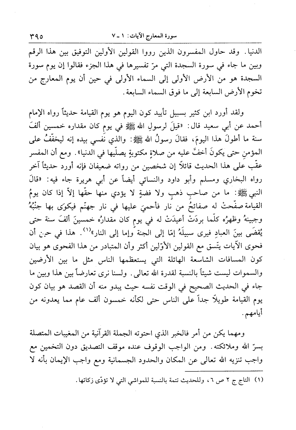 ولقد أورد ابن كثير بسبيل تأييد كون اليوم هو يوم القيامة حديثا رواه الإمام أحمد عن أبي سعيد قال: «قيل لرسول الله صلى الله عليه وسلم في يوم كان مقداره خمسين ألف سنة ما أطول هذا اليوم، فقال رسول الله صلى الله عليه وسلم: والذي نفسي بيده إنه ليخفّف على المؤمن حتى يكون أخفّ عليه من صلاة مكتوبة يصلّيها في الدنيا» . ومع أن المفسر عقّب على هذا الحديث قائلا إن شخصين من رواته ضعيفان فإنه أورد حديثا آخر رواه البخاري ومسلم وأبو داود والنسائي أيضا عن أبي هريرة جاء فيه: «قال النبي صلى الله عليه وسلم: ما من صاحب ذهب ولا فضة لا يؤدي منها حقّها إلّا إذا كان يوم القيامة صفّحت له صفائح من نار فأحمي عليها في نار جهنّم فيكوى بها جنبه وجبينه وظهره كلّما بردت أعيدت له في يوم كان مقداره خمسين ألف سنة حتى يقضى بين العباد فيرى سبيله إمّا إلى الجنة وإما إلى النار» «1» . هذا في حين أن فحوى الآيات يتّسق مع القولين الأوّلين أكثر وأن المتبادر من هذا الفحوى هو بيان كون المسافات الشاسعة الهائلة التي يستعظمها الناس مثل ما بين الأرضين والسموات ليست شيئا بالنسبة لقدرة الله تعالى. ولسنا نرى تعارضا بين هذا وبين ما جاء في الحديث الصحيح في الوقت نفسه حيث يبدو منه أن القصد هو بيان كون يوم القيامة طويلا جدا على الناس حتى لكأنه خمسون ألف عام مما يعدونه من أيامهم.