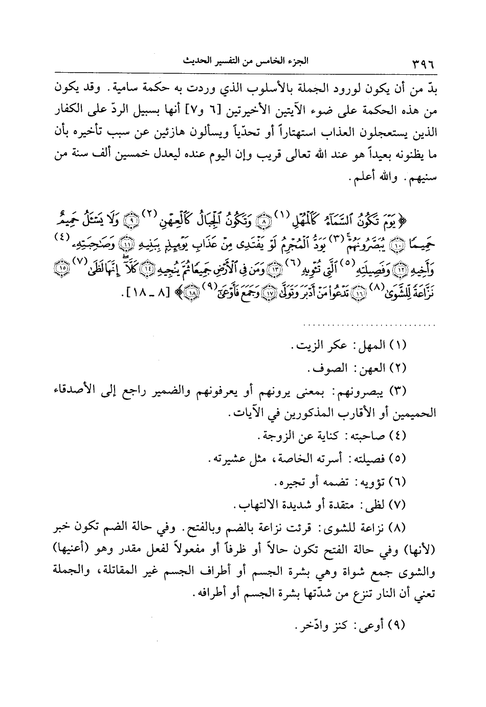 (8) نزاعة للشوى: قرئت نزاعة بالضم وبالفتح. وفي حالة الضم تكون خبر (لأنها) وفي حالة الفتح تكون حالا أو ظرفا أو مفعولا لفعل مقدر وهو (أعنيها) والشوى جمع شواة وهي بشرة الجسم أو أطراف الجسم غير المقاتلة، والجملة تعني أن النار تنزع من شدّتها بشرة الجسم أو أطرافه.