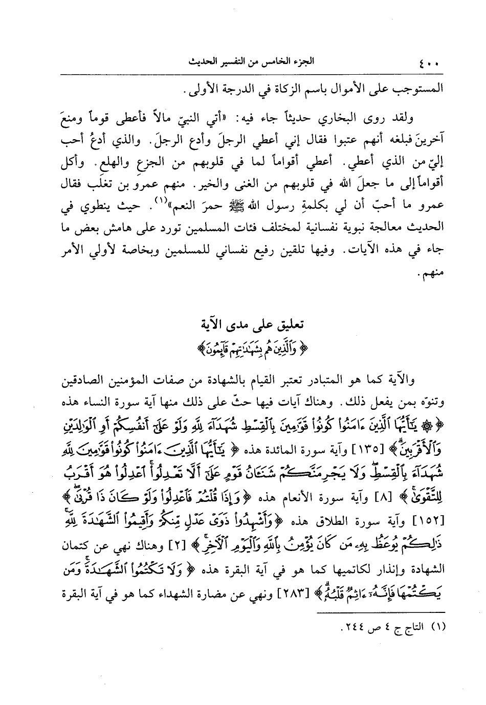 والآية كما هو المتبادر تعتبر القيام بالشهادة من صفات المؤمنين الصادقين وتنوّه بمن يفعل ذلك. وهناك آيات فيها حثّ على ذلك منها آية سورة النساء هذه يا أَيُّهَا الَّذِينَ آمَنُوا كُونُوا قَوَّامِينَ بِالْقِسْطِ شُهَداءَ لِلَّهِ وَلَوْ عَلى أَنْفُسِكُمْ أَوِ الْوالِدَيْنِ وَالْأَقْرَبِينَ [135] وآية سورة المائدة هذه يا أَيُّهَا الَّذِينَ آمَنُوا كُونُوا قَوَّامِينَ لِلَّهِ شُهَداءَ بِالْقِسْطِ وَلا يَجْرِمَنَّكُمْ شَنَآنُ قَوْمٍ عَلى أَلَّا تَعْدِلُوا اعْدِلُوا هُوَ أَقْرَبُ لِلتَّقْوى [8] وآية سورة الأنعام هذه وَإِذا قُلْتُمْ فَاعْدِلُوا وَلَوْ كانَ ذا قُرْبى