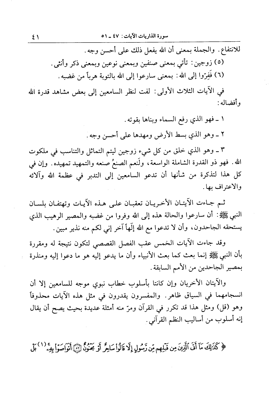 ثم جاءت الآيتان الأخريان تعقبان على هذه الآيات وتهتفان بلسان النبي صلى الله عليه وسلم: أن سارعوا والحالة هذه إلى الله وفروا من غضبه والمصير الرهيب الذي يستحقه الجاحدون، وأن لا تدعوا مع الله إلها آخر إني لكم منه نذير مبين.