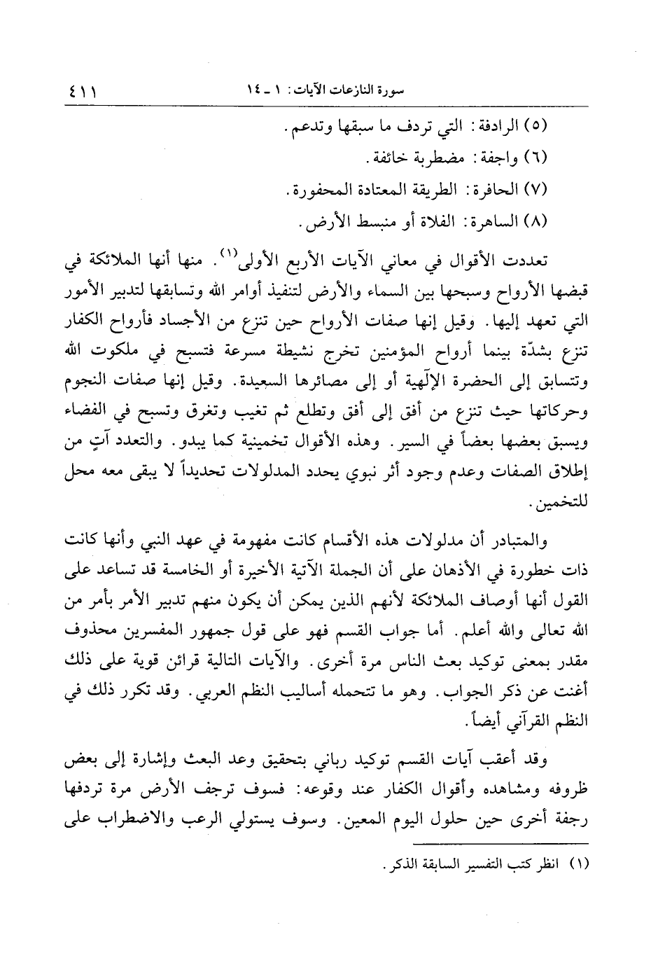 تعددت الأقوال في معاني الآيات الأربع الأولى «1» . منها أنها الملائكة في قبضها الأرواح وسبحها بين السماء والأرض لتنفيذ أوامر الله وتسابقها لتدبير الأمور التي تعهد إليها. وقيل إنها صفات الأرواح حين تنزع من الأجساد فأرواح الكفار تنزع بشدّة بينما أرواح المؤمنين تخرج نشيطة مسرعة فتسبح في ملكوت الله وتتسابق إلى الحضرة الإلهية أو إلى مصائرها السعيدة. وقيل إنها صفات النجوم وحركاتها حيث تنزع من أفق إلى أفق وتطلع ثم تغيب وتغرق وتسبح في الفضاء ويسبق بعضها بعضا في السير. وهذه الأقوال تخمينية كما يبدو. والتعدد آت من إطلاق الصفات وعدم وجود أثر نبوي يحدد المدلولات تحديدا لا يبقى معه محل للتخمين.