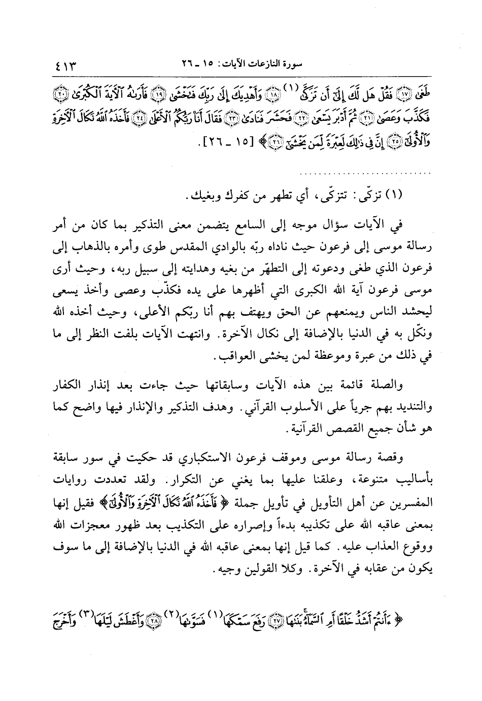 وقصة رسالة موسى وموقف فرعون الاستكباري قد حكيت في سور سابقة بأساليب متنوعة، وعلقنا عليها بما يغني عن التكرار. ولقد تعددت روايات المفسرين عن أهل التأويل في تأويل جملة فَأَخَذَهُ اللَّهُ نَكالَ الْآخِرَةِ وَالْأُولى فقيل إنها بمعنى عاقبه الله على تكذيبه بدءا وإصراره على التكذيب بعد ظهور معجزات الله ووقوع العذاب عليه. كما قيل إنها بمعنى عاقبه الله في الدنيا بالإضافة إلى ما سوف يكون من عقابه في الآخرة. وكلا القولين وجيه.