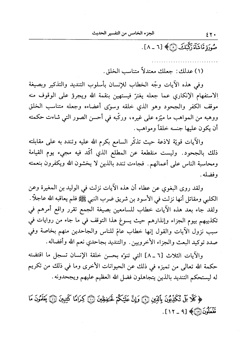 والآيات الثلاث [6- 8] التي تنوّه بحسن خلقة الإنسان تسجل ما اقتضته حكمة الله تعالى من تميزه في ذلك عن الحيوانات الأخرى وما في ذلك من تكريم له ليستحكم التنديد بالذين يتجاهلون فضل الله العظيم عليهم ويجحدونه.