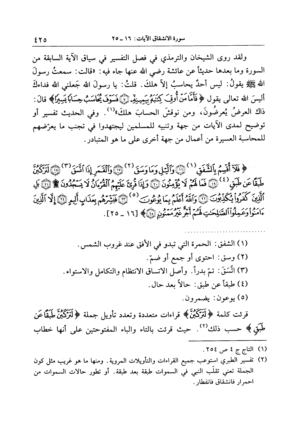 قرئت كلمة لَتَرْكَبُنَّ قراءات متعددة وتعدد تأويل جملة لَتَرْكَبُنَّ طَبَقاً عَنْ طَبَقٍ حسب ذلك «2» . حيث قرئت بالتاء والباء المفتوحتين على أنها خطاب