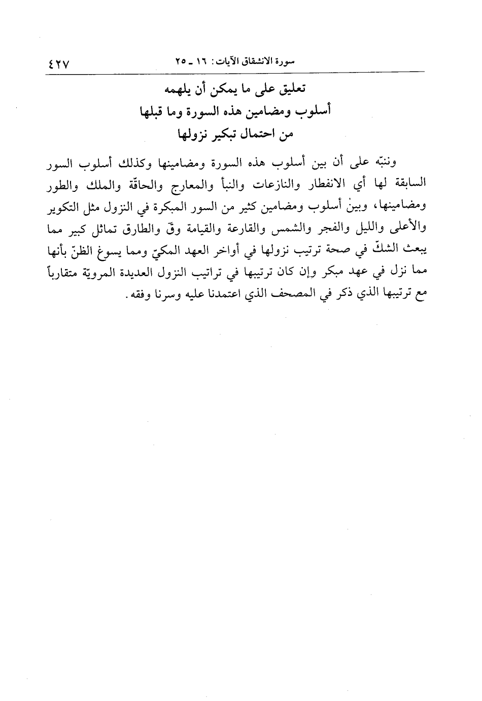 وننبّه على أن بين أسلوب هذه السورة ومضامينها وكذلك أسلوب السور السابقة لها أي الانفطار والنازعات والنبأ والمعارج والحاقّة والملك والطور ومضامينها، وبين أسلوب ومضامين كثير من السور المبكرة في النزول مثل التكوير والأعلى والليل والفجر والشمس والقارعة والقيامة وق والطارق تماثل كبير مما يبعث الشكّ في صحة ترتيب نزولها في أواخر العهد المكيّ ومما يسوغ الظنّ بأنها مما نزل في عهد مبكر وإن كان ترتيبها في تراتيب النزول العديدة المرويّة متقاربا مع ترتيبها الذي ذكر في المصحف الذي اعتمدنا عليه وسرنا وفقه.
