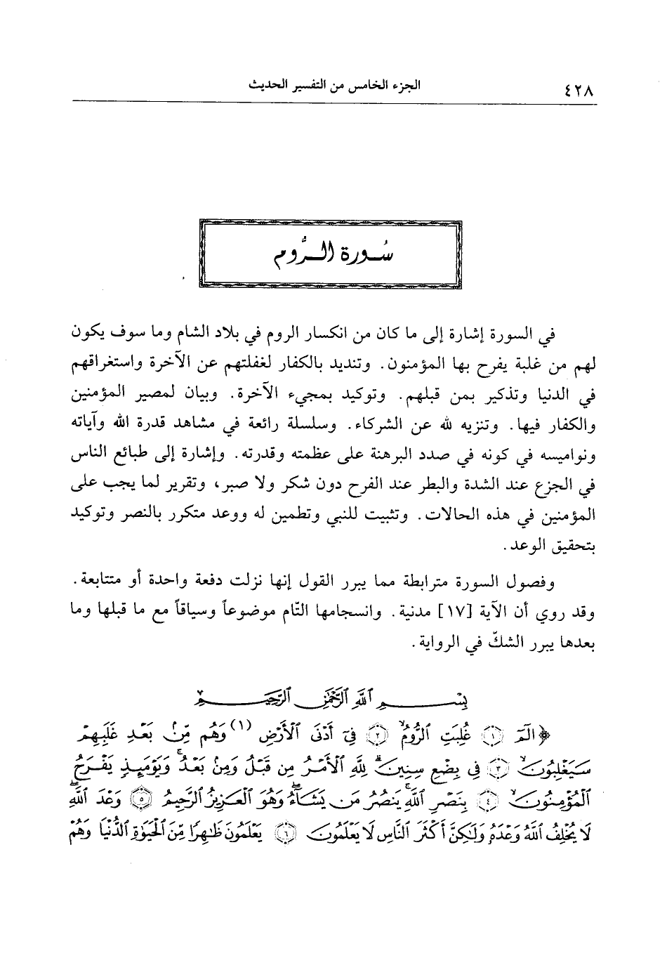 في السورة إشارة إلى ما كان من انكسار الروم في بلاد الشام وما سوف يكون لهم من غلبة يفرح بها المؤمنون. وتنديد بالكفار لغفلتهم عن الآخرة واستغراقهم في الدنيا وتذكير بمن قبلهم. وتوكيد بمجيء الآخرة. وبيان لمصير المؤمنين والكفار فيها. وتنزيه لله عن الشركاء. وسلسلة رائعة في مشاهد قدرة الله وآياته ونواميسه في كونه في صدد البرهنة على عظمته وقدرته. وإشارة إلى طبائع الناس في الجزع عند الشدة والبطر عند الفرح دون شكر ولا صبر، وتقرير لما يجب على المؤمنين في هذه الحالات. وتثبيت للنبي وتطمين له ووعد متكرر بالنصر وتوكيد بتحقيق الوعد.