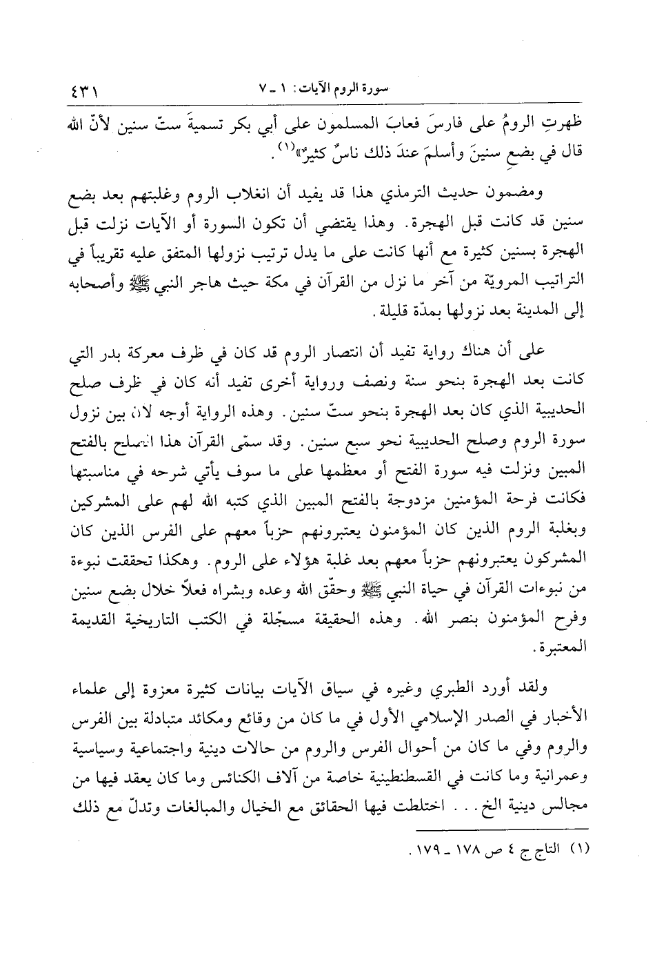 ولقد أورد الطبري وغيره في سياق الآيات بيانات كثيرة معزوة إلى علماء الأخبار في الصدر الإسلامي الأول في ما كان من وقائع ومكائد متبادلة بين الفرس والروم وفي ما كان من أحوال الفرس والروم من حالات دينية واجتماعية وسياسية وعمرانية وما كانت في القسطنطينية خاصة من آلاف الكنائس وما كان يعقد فيها من مجالس دينية إلخ ... اختلطت فيها الحقائق مع الخيال والمبالغات وتدلّ مع ذلك