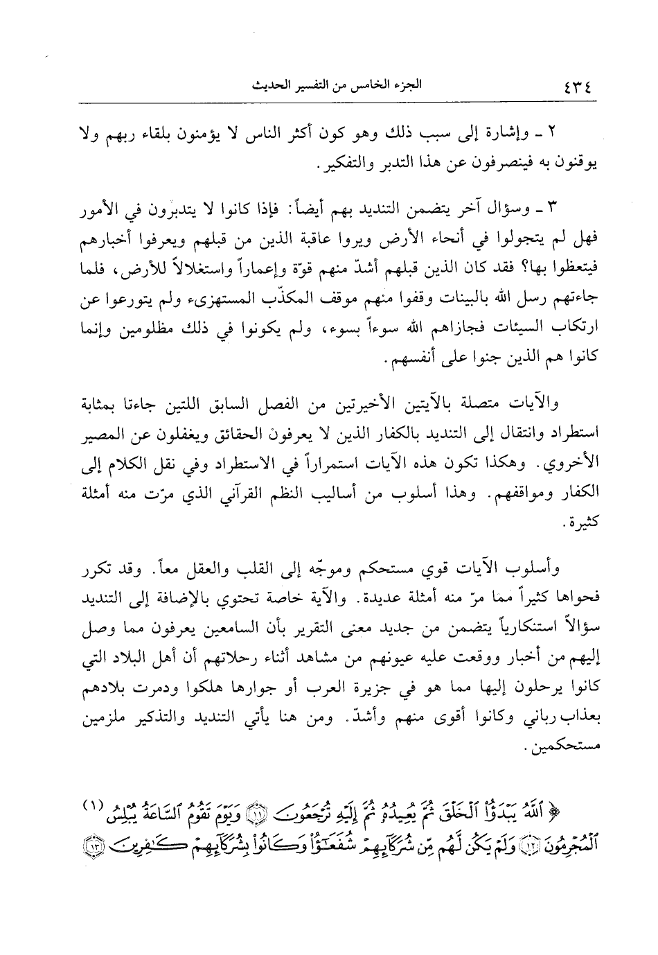 والآيات متصلة بالآيتين الأخيرتين من الفصل السابق اللتين جاءتا بمثابة استطراد وانتقال إلى التنديد بالكفار الذين لا يعرفون الحقائق ويغفلون عن المصير الأخروي. وهكذا تكون هذه الآيات استمرارا في الاستطراد وفي نقل الكلام إلى الكفار ومواقفهم. وهذا أسلوب من أساليب النظم القرآني الذي مرّت منه أمثلة كثيرة.