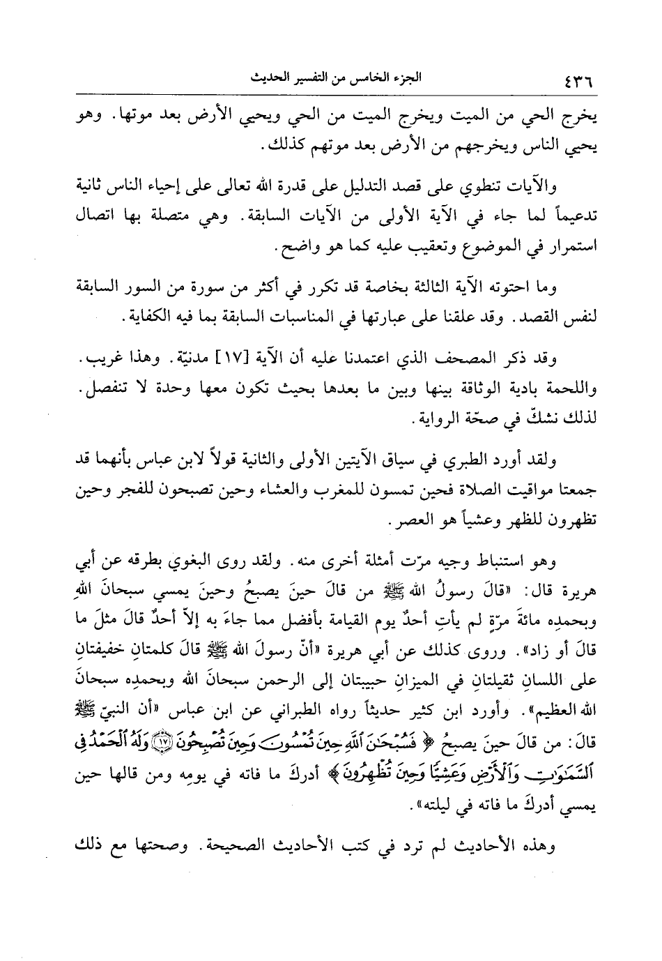 وهو استنباط وجيه مرّت أمثلة أخرى منه. ولقد روى البغوي بطرقه عن أبي هريرة قال: «قال رسول الله صلى الله عليه وسلم من قال حين يصبح وحين يمسي سبحان الله وبحمده مائة مرّة لم يأت أحد يوم القيامة بأفضل مما جاء به إلّا أحد قال مثل ما قال أو زاد» . وروى كذلك عن أبي هريرة «أنّ رسول الله صلى الله عليه وسلم قال كلمتان خفيفتان على اللسان ثقيلتان في الميزان حبيبتان إلى الرّحمن سبحان الله وبحمده سبحان الله العظيم» . وأورد ابن كثير حديثا رواه الطبراني عن ابن عباس «أن النبيّ صلى الله عليه وسلم قال: من قال حين يصبح فَسُبْحانَ اللَّهِ حِينَ تُمْسُونَ وَحِينَ تُصْبِحُونَ (17) وَلَهُ الْحَمْدُ فِي السَّماواتِ وَالْأَرْضِ وَعَشِيًّا وَحِينَ تُظْهِرُونَ أدرك ما فاته في يومه ومن قالها حين يمسي أدرك ما فاته في ليلته» .