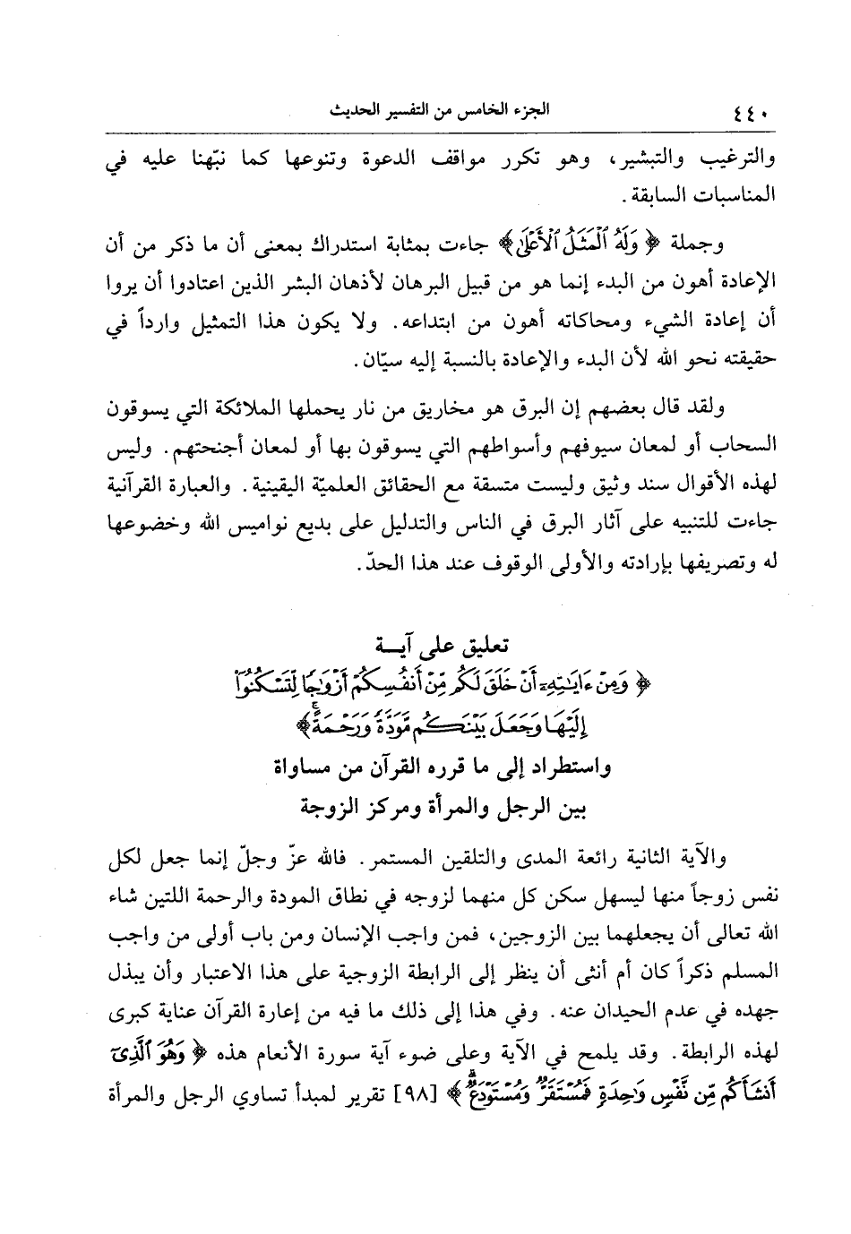 تعليق على آية وَمِنْ آياتِهِ أَنْ خَلَقَ لَكُمْ مِنْ أَنْفُسِكُمْ أَزْواجاً لِتَسْكُنُوا إِلَيْها وَجَعَلَ بَيْنَكُمْ مَوَدَّةً وَرَحْمَةً واستطراد إلى ما قرره القرآن من مساواة بين الرجل والمرأة ومركز الزوجة