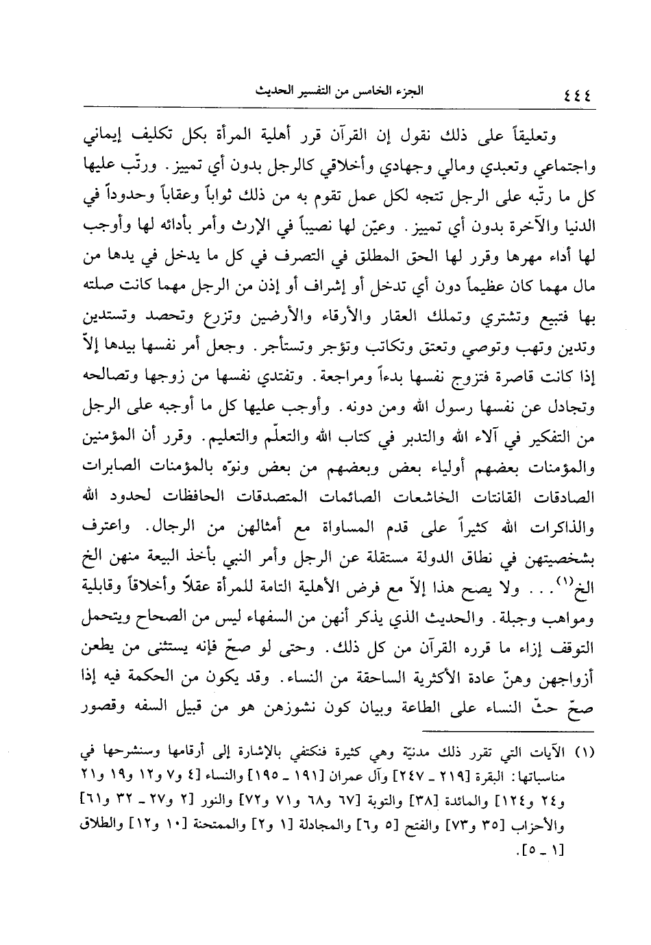 وتعليقا على ذلك نقول إن القرآن قرر أهلية المرأة بكل تكليف إيماني واجتماعي وتعبدي ومالي وجهادي وأخلاقي كالرجل بدون أي تمييز. ورتّب عليها كل ما رتّبه على الرجل تتجه لكل عمل تقوم به من ذلك ثوابا وعقابا وحدودا في الدنيا والآخرة بدون أي تمييز. وعيّن لها نصيبا في الإرث وأمر بأدائه لها وأوجب لها أداء مهرها وقرر لها الحق المطلق في التصرف في كل ما يدخل في يدها من مال مهما كان عظيما دون أي تدخل أو إشراف أو إذن من الرجل مهما كانت صلته بها فتبيع وتشتري وتملك العقار والأرقاء والأرضين وتزرع وتحصد وتستدين وتدين وتهب وتوصي وتعتق وتكاتب وتؤجر وتستأجر. وجعل أمر نفسها بيدها إلّا إذا كانت قاصرة فتزوج نفسها بدءا ومراجعة. وتفتدي نفسها من زوجها وتصالحه وتجادل عن نفسها رسول الله ومن دونه. وأوجب عليها كل ما أوجبه على الرجل من التفكير في آلاء الله والتدبر في كتاب الله والتعلّم والتعليم. وقرر أن المؤمنين والمؤمنات بعضهم أولياء بعض وبعضهم من بعض ونوّه بالمؤمنات الصابرات الصادقات القانتات الخاشعات الصائمات المتصدقات الحافظات لحدود الله والذاكرات الله كثيرا على قدم المساواة مع أمثالهن من الرجال. واعترف بشخصيتهن في نطاق الدولة مستقلة عن الرجل وأمر النبي بأخذ البيعة منهن إلخ إلخ «1» ... ولا يصح هذا إلّا مع فرض الأهلية التامة للمرأة عقلا وأخلاقا وقابلية ومواهب وجبلة. والحديث الذي يذكر أنهن من السفهاء ليس من الصحاح ويتحمل التوقف إزاء ما قرره القرآن من كل ذلك. وحتى لو صحّ فإنه يستثنى من يطعن أزواجهن وهنّ عادة الأكثرية الساحقة من النساء. وقد يكون من الحكمة فيه إذا صحّ حثّ النساء على الطاعة وبيان كون نشوزهن هو من قبيل السفه وقصور