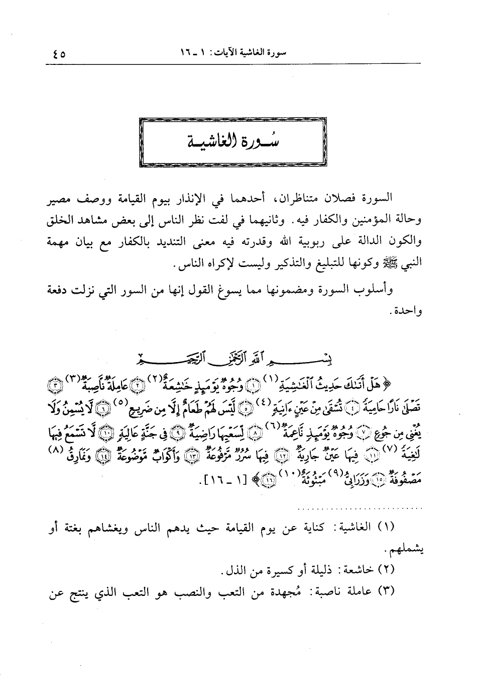 هَلْ أَتاكَ حَدِيثُ الْغاشِيَةِ (1) وُجُوهٌ يَوْمَئِذٍ خاشِعَةٌ (2) عامِلَةٌ ناصِبَةٌ (3) تَصْلى ناراً حامِيَةً (4)