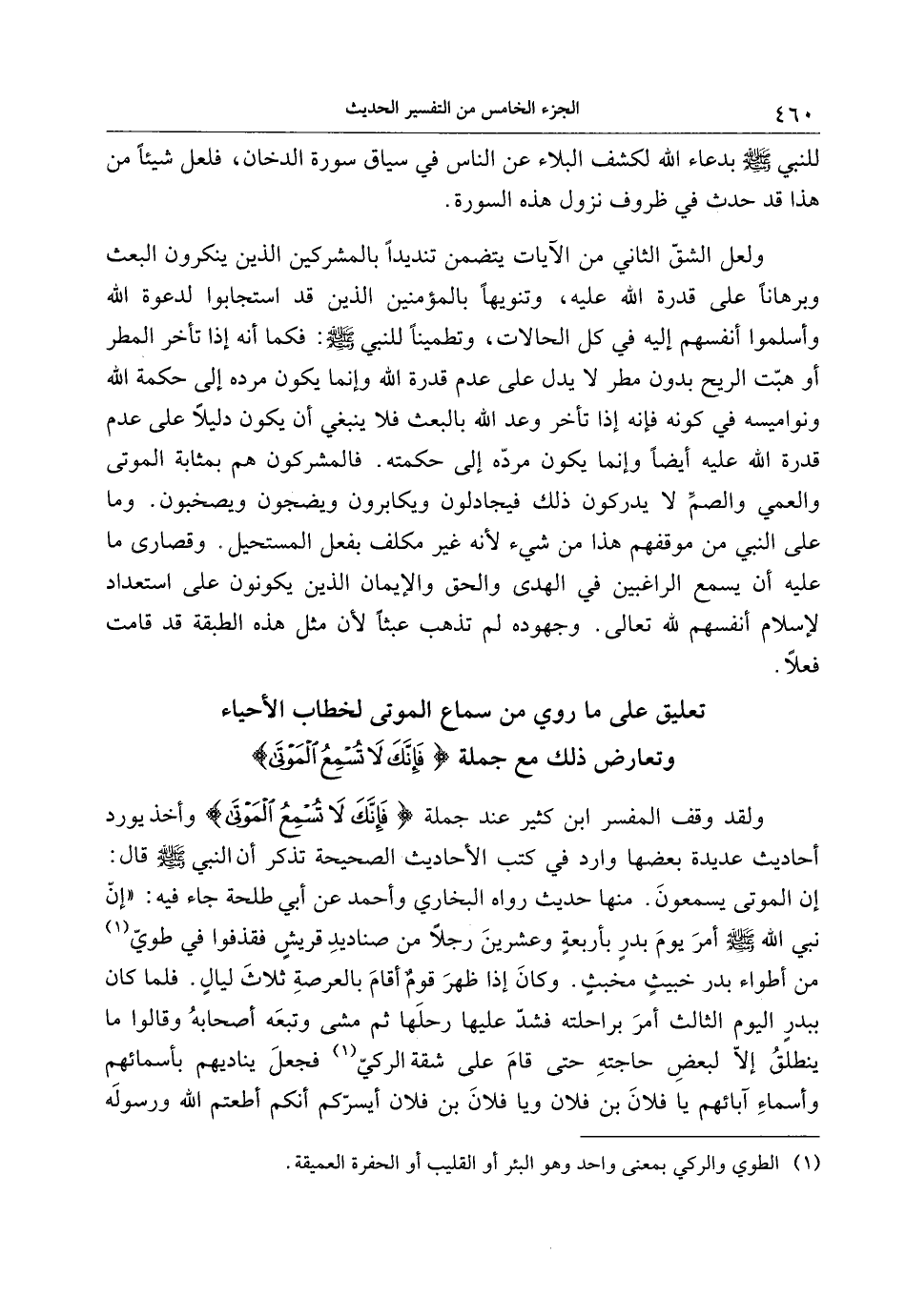 ولقد وقف المفسر ابن كثير عند جملة فَإِنَّكَ لا تُسْمِعُ الْمَوْتى وأخذ يورد أحاديث عديدة بعضها وارد في كتب الأحاديث الصحيحة تذكر أن النبي صلى الله عليه وسلم قال: