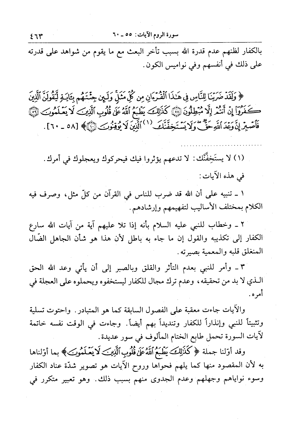 وَلَقَدْ ضَرَبْنا لِلنَّاسِ فِي هذَا الْقُرْآنِ مِنْ كُلِّ مَثَلٍ وَلَئِنْ جِئْتَهُمْ بِآيَةٍ لَيَقُولَنَّ الَّذِينَ كَفَرُوا إِنْ أَنْتُمْ إِلاَّ مُبْطِلُونَ (58) كَذلِكَ يَطْبَعُ اللَّهُ عَلى قُلُوبِ الَّذِينَ لا يَعْلَمُونَ (59) فَاصْبِرْ إِنَّ وَعْدَ اللَّهِ حَقٌّ وَلا يَسْتَخِفَّنَّكَ الَّذِينَ لا يُوقِنُونَ (60)
