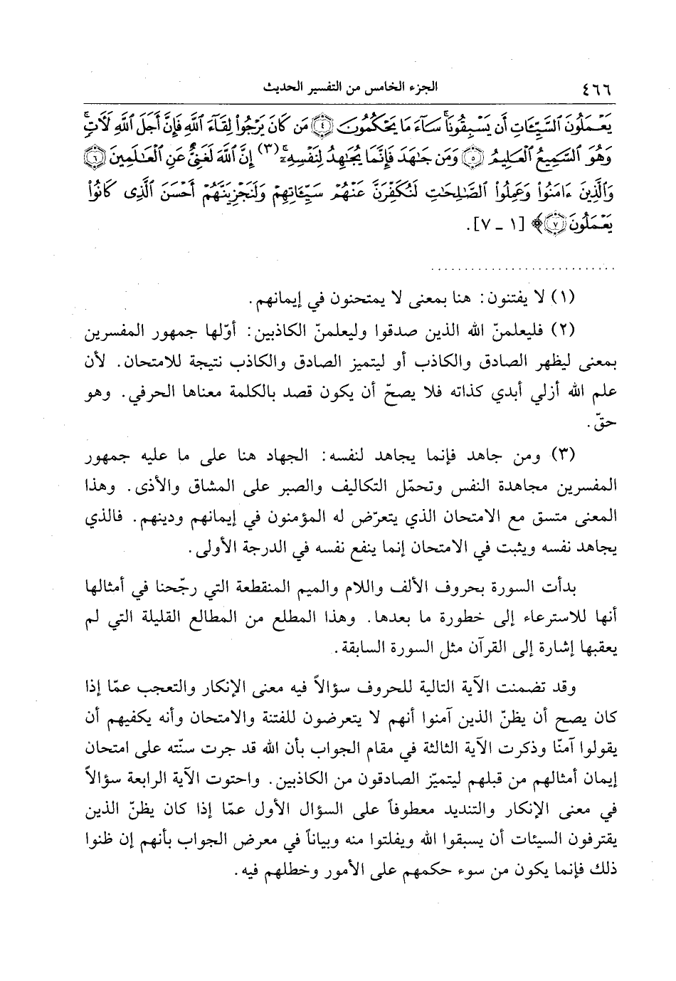 (2) فليعلمنّ الله الذين صدقوا وليعلمنّ الكاذبين: أوّلها جمهور المفسرين بمعنى ليظهر الصادق والكاذب أو ليتميز الصادق والكاذب نتيجة للامتحان. لأن علم الله أزلي أبدي كذاته فلا يصحّ أن يكون قصد بالكلمة معناها الحرفي. وهو حقّ.