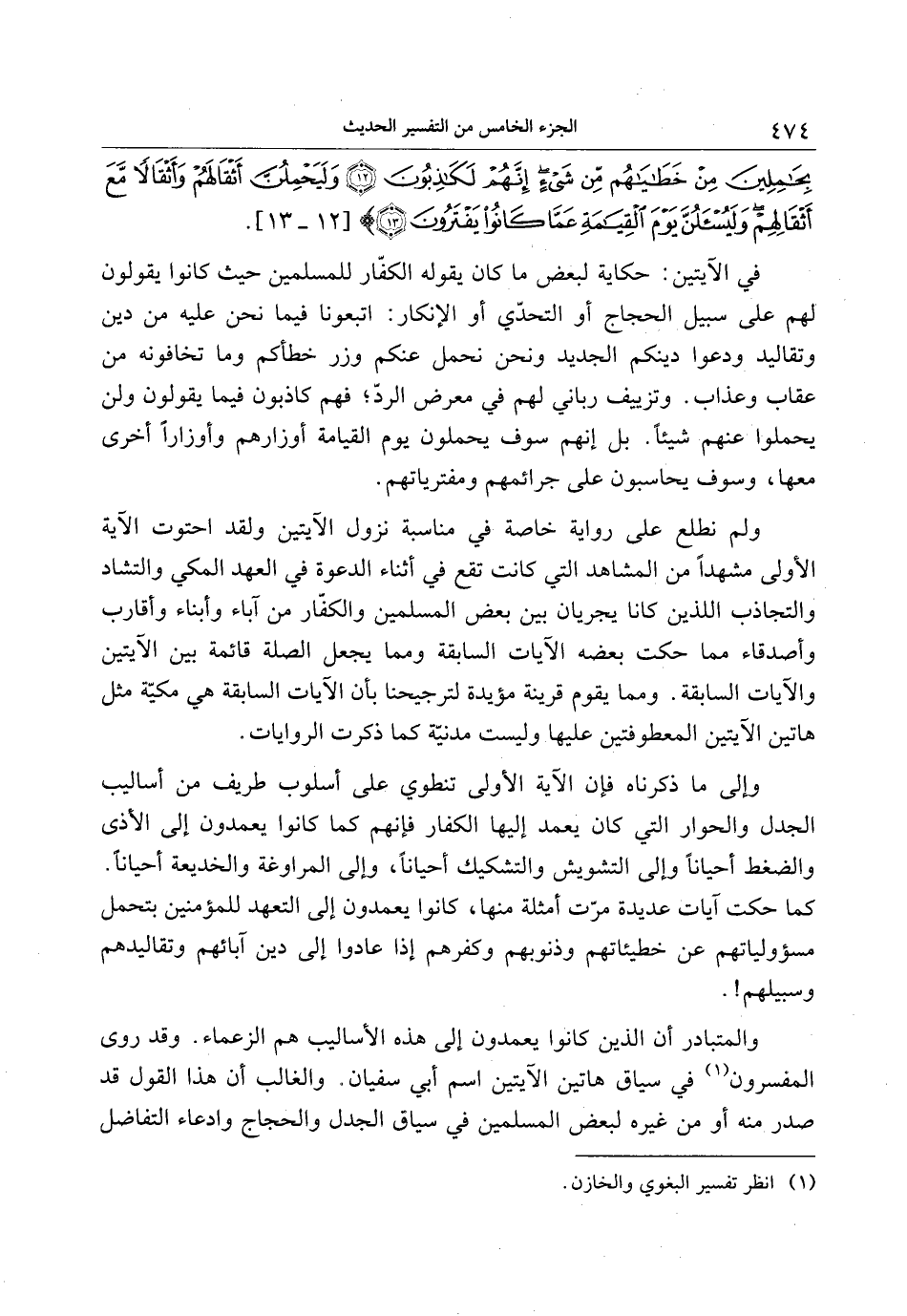 في الآيتين: حكاية لبعض ما كان يقوله الكفّار للمسلمين حيث كانوا يقولون لهم على سبيل الحجاج أو التحدّي أو الإنكار: اتبعونا فيما نحن عليه من دين وتقاليد ودعوا دينكم الجديد ونحن نحمل عنكم وزر خطأكم وما تخافونه من عقاب وعذاب. وتزييف رباني لهم في معرض الردّ فهم كاذبون فيما يقولون ولن يحملوا عنهم شيئا. بل إنهم سوف يحملون يوم القيامة أوزارهم وأوزارا أخرى معها، وسوف يحاسبون على جرائمهم ومفترياتهم.