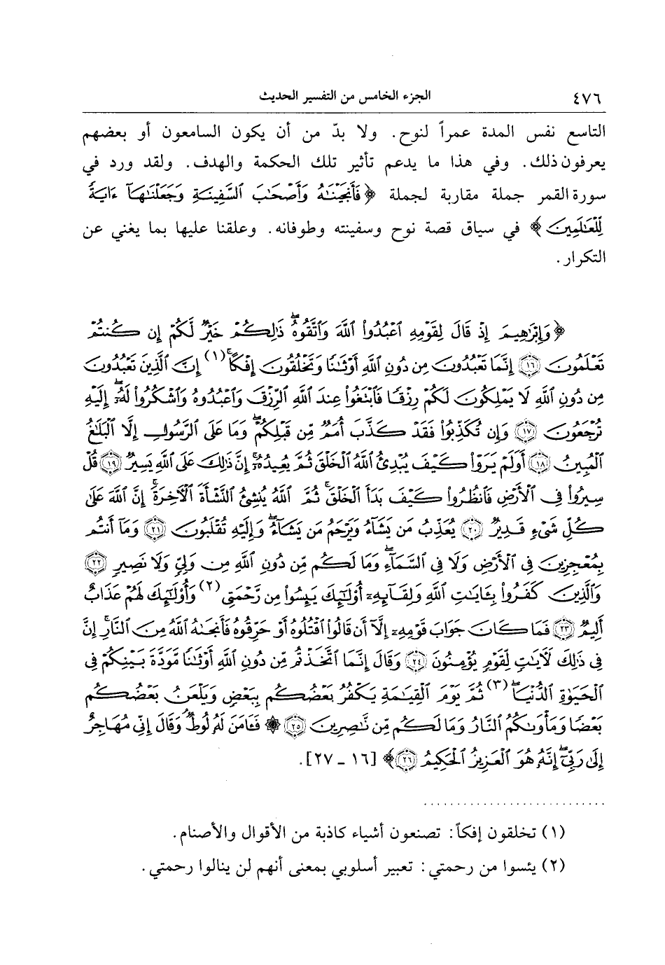 وَإِبْراهِيمَ إِذْ قالَ لِقَوْمِهِ اعْبُدُوا اللَّهَ وَاتَّقُوهُ ذلِكُمْ خَيْرٌ لَكُمْ إِنْ كُنْتُمْ تَعْلَمُونَ (16) إِنَّما تَعْبُدُونَ مِنْ دُونِ اللَّهِ أَوْثاناً وَتَخْلُقُونَ إِفْكاً إِنَّ الَّذِينَ تَعْبُدُونَ مِنْ دُونِ اللَّهِ لا يَمْلِكُونَ لَكُمْ رِزْقاً فَابْتَغُوا عِنْدَ اللَّهِ الرِّزْقَ وَاعْبُدُوهُ وَاشْكُرُوا لَهُ إِلَيْهِ تُرْجَعُونَ (17) وَإِنْ تُكَذِّبُوا فَقَدْ كَذَّبَ أُمَمٌ مِنْ قَبْلِكُمْ وَما عَلَى الرَّسُولِ إِلاَّ الْبَلاغُ الْمُبِينُ (18) أَوَلَمْ يَرَوْا كَيْفَ يُبْدِئُ اللَّهُ الْخَلْقَ ثُمَّ يُعِيدُهُ إِنَّ ذلِكَ عَلَى اللَّهِ يَسِيرٌ (19) قُلْ سِيرُوا فِي الْأَرْضِ فَانْظُرُوا كَيْفَ بَدَأَ الْخَلْقَ ثُمَّ اللَّهُ يُنْشِئُ النَّشْأَةَ الْآخِرَةَ إِنَّ اللَّهَ عَلى كُلِّ شَيْءٍ قَدِيرٌ (20)
