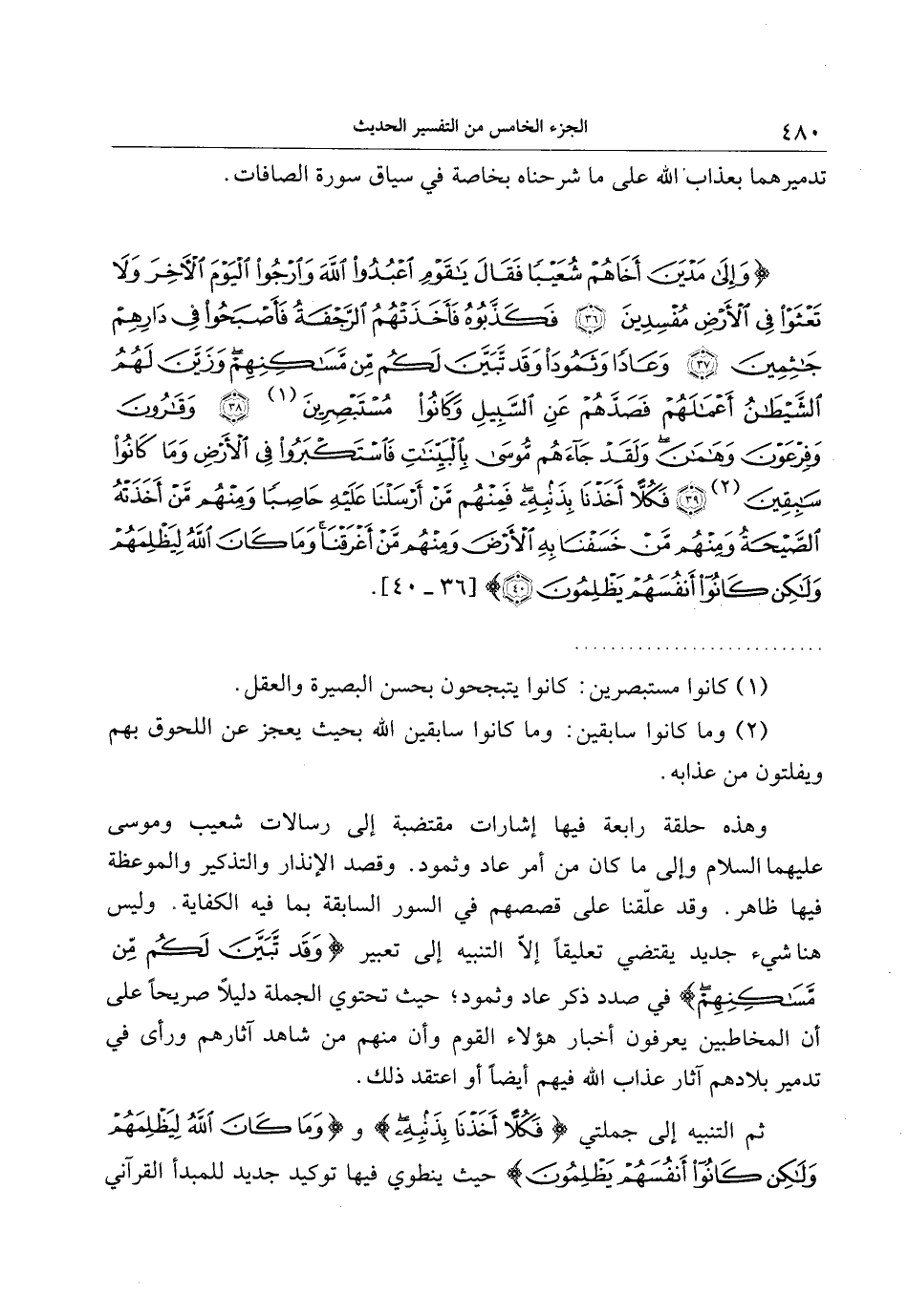وهذه حلقة رابعة فيها إشارات مقتضبة إلى رسالات شعيب وموسى عليهما السلام وإلى ما كان من أمر عاد وثمود. وقصد الإنذار والتذكير والموعظة فيها ظاهر. وقد علّقنا على قصصهم في السور السابقة بما فيه الكفاية. وليس هنا شيء جديد يقتضي تعليقا إلّا التنبيه إلى تعبير وَقَدْ تَبَيَّنَ لَكُمْ مِنْ مَساكِنِهِمْ في صدد ذكر عاد وثمود حيث تحتوي الجملة دليلا صريحا على أن المخاطبين يعرفون أخبار هؤلاء القوم وأن منهم من شاهد آثارهم ورأى في تدمير بلادهم آثار عذاب الله فيهم أيضا أو اعتقد ذلك.