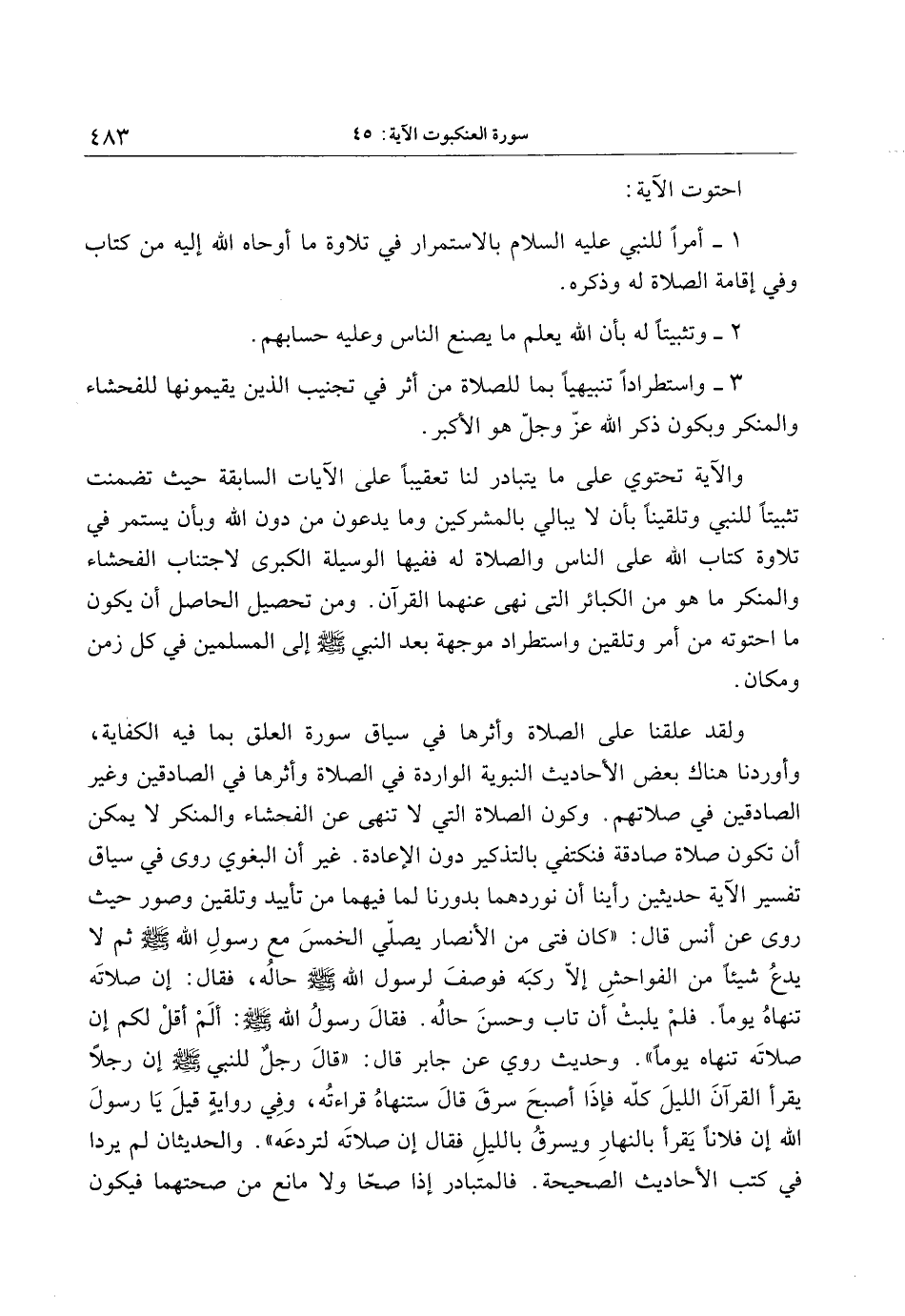 ولقد علقنا على الصلاة وأثرها في سياق سورة العلق بما فيه الكفاية، وأوردنا هناك بعض الأحاديث النبوية الواردة في الصلاة وأثرها في الصادقين وغير الصادقين في صلاتهم. وكون الصلاة التي لا تنهى عن الفحشاء والمنكر لا يمكن أن تكون صلاة صادقة فنكتفي بالتذكير دون الإعادة. غير أن البغوي روى في سياق تفسير الآية حديثين رأينا أن نوردهما بدورنا لما فيهما من تأييد وتلقين وصور حيث روى عن أنس قال: «كان فتى من الأنصار يصلّي الخمس مع رسول الله صلى الله عليه وسلم ثم لا يدع شيئا من الفواحش إلّا ركبه فوصف لرسول الله صلى الله عليه وسلم حاله، فقال: إن صلاته تنهاه يوما. فلم يلبث أن تاب وحسن حاله. فقال رسول الله صلى الله عليه وسلم: ألم أقل لكم إن صلاته تنهاه يوما» . وحديث روي عن جابر قال: «قال رجل للنبي صلى الله عليه وسلم إن رجلا يقرأ القرآن الليل كلّه فإذا أصبح سرق قال ستنهاه قراءته، وفي رواية قيل يا رسول الله إن فلانا يقرأ بالنهار ويسرق بالليل فقال إن صلاته لتردعه» . والحديثان لم يردا في كتب الأحاديث الصحيحة. فالمتبادر إذا صحّا ولا مانع من صحتهما فيكون