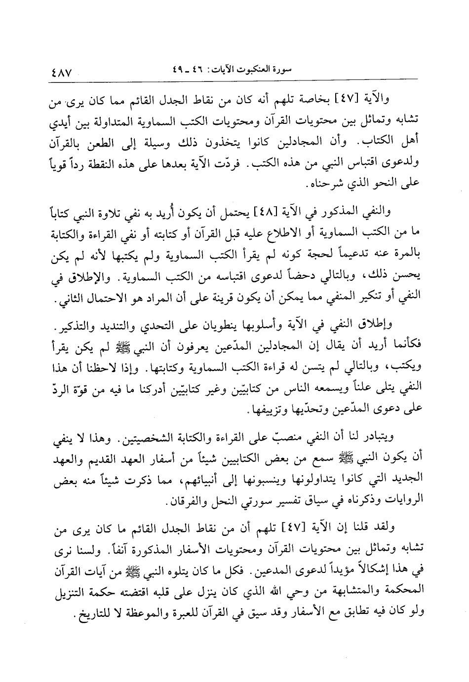 ولقد قلنا إن الآية [47] تلهم أن من نقاط الجدل القائم ما كان يرى من تشابه وتماثل بين محتويات القرآن ومحتويات الأسفار المذكورة آنفا. ولسنا نرى في هذا إشكالا مؤيدا لدعوى المدعين. فكل ما كان يتلوه النبي صلى الله عليه وسلم من آيات القرآن المحكمة والمتشابهة من وحي الله الذي كان ينزل على قلبه اقتضته حكمة التنزيل ولو كان فيه تطابق مع الأسفار وقد سيق في القرآن للعبرة والموعظة لا للتاريخ.