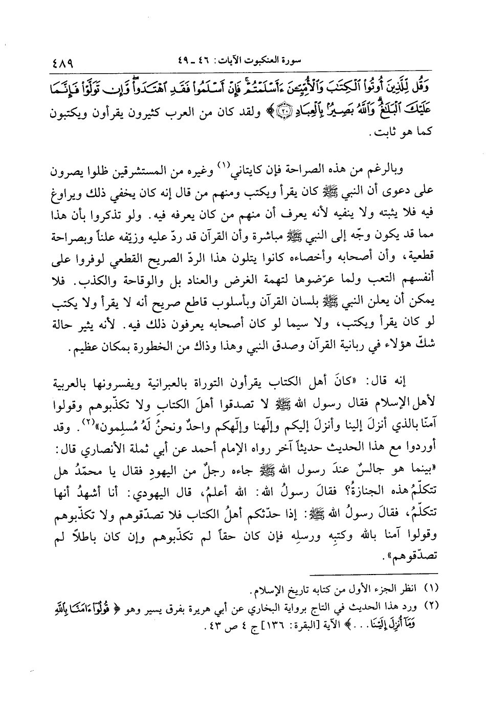 وبالرغم من هذه الصراحة فإن كايتاني «1» وغيره من المستشرقين ظلوا يصرون على دعوى أن النبي صلى الله عليه وسلم كان يقرأ ويكتب ومنهم من قال إنه كان يخفي ذلك ويراوغ فيه فلا يثبته ولا ينفيه لأنه يعرف أن منهم من كان يعرفه فيه. ولو تذكروا بأن هذا مما قد يكون وجّه إلى النبي صلى الله عليه وسلم مباشرة وأن القرآن قد ردّ عليه وزيّفه علنا وبصراحة قطعية، وأن أصحابه وأخصاءه كانوا يتلون هذا الردّ الصريح القطعي لوفروا على أنفسهم التعب ولما عرّضوها لتهمة الغرض والعناد بل والوقاحة والكذب. فلا يمكن أن يعلن النبي صلى الله عليه وسلم بلسان القرآن وبأسلوب قاطع صريح أنه لا يقرأ ولا يكتب لو كان يقرأ ويكتب، ولا سيما لو كان أصحابه يعرفون ذلك فيه. لأنه يثير حالة شكّ هؤلاء في ربانية القرآن وصدق النبي وهذا وذاك من الخطورة بمكان عظيم.