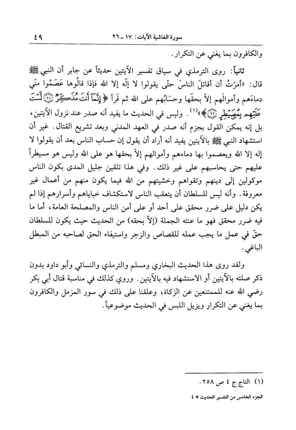 ثانيا: روى الترمذي في سياق تفسير الآيتين حديثا عن جابر أن النبي صلى الله عليه وسلم قال: «أمرت أن أقاتل الناس حتّى يقولوا لا إله إلا الله فإذا قالوها عصموا منّي دماءهم وأموالهم إلّا بحقّها وحسابهم على الله ثم قرأ إِنَّما أَنْتَ مُذَكِّرٌ (21) لَسْتَ عَلَيْهِمْ بِمُصَيْطِرٍ (22) «1» . وليس في الحديث ما يفيد أنه صدر عند نزول الآيتين، بل إنه يمكن القول بجزم أنه صدر في العهد المدني وبعد تشريع القتال. غير أن استشهاد النبي صلى الله عليه وسلم بالآيتين يفيد أنه أراد أن يقول إن حساب الناس بعد أن يقولوا لا إله إلا الله ويعصموا بها دماءهم وأموالهم إلّا بحقها هو على الله وليس هو مسيطرا عليهم حتى يحاسبهم على غير ذلك. وفي هذا تلقين جليل المدى بكون الناس موكولين إلى دينهم وتقواهم وخشيتهم من الله فيما يكون منهم من أعمال غير معروفة. وأنه ليس للسلطان أن يتعقب الناس لاستكشاف خباياهم وأسرارهم إذا لم يكن دليل على ضرر محقق على أحد أو على أمن الناس والمصلحة العامة، أما ما فيه ضرر محقق فهو ما عنته الجملة (إلّا بحقه) من الحديث حيث يكون للسلطان حقّ في عمل ما يجب عمله للقصاص والزجر واستيفاء الحق لصاحبه من المبطل الباغي.