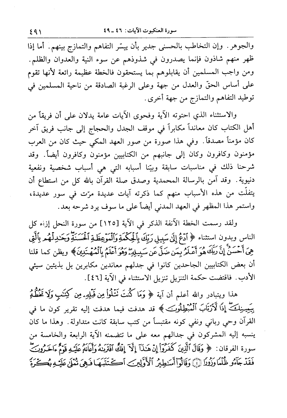 ولقد رسمت الخطة الآنفة الذكر في الآية [125] من سورة النحل إزاء كل الناس وبدون استثناء ادْعُ إِلى سَبِيلِ رَبِّكَ بِالْحِكْمَةِ وَالْمَوْعِظَةِ الْحَسَنَةِ وَجادِلْهُمْ بِالَّتِي هِيَ أَحْسَنُ إِنَّ رَبَّكَ هُوَ أَعْلَمُ بِمَنْ ضَلَّ عَنْ سَبِيلِهِ وَهُوَ أَعْلَمُ بِالْمُهْتَدِينَ ويظن كما قلنا أن بعض الكتابيين الجاحدين كانوا في جدلهم معاندين مكابرين بل بذيئين سيئي الأدب. فاقتضت حكمة التنزيل تنزيل الاستثناء في الآية [46] .