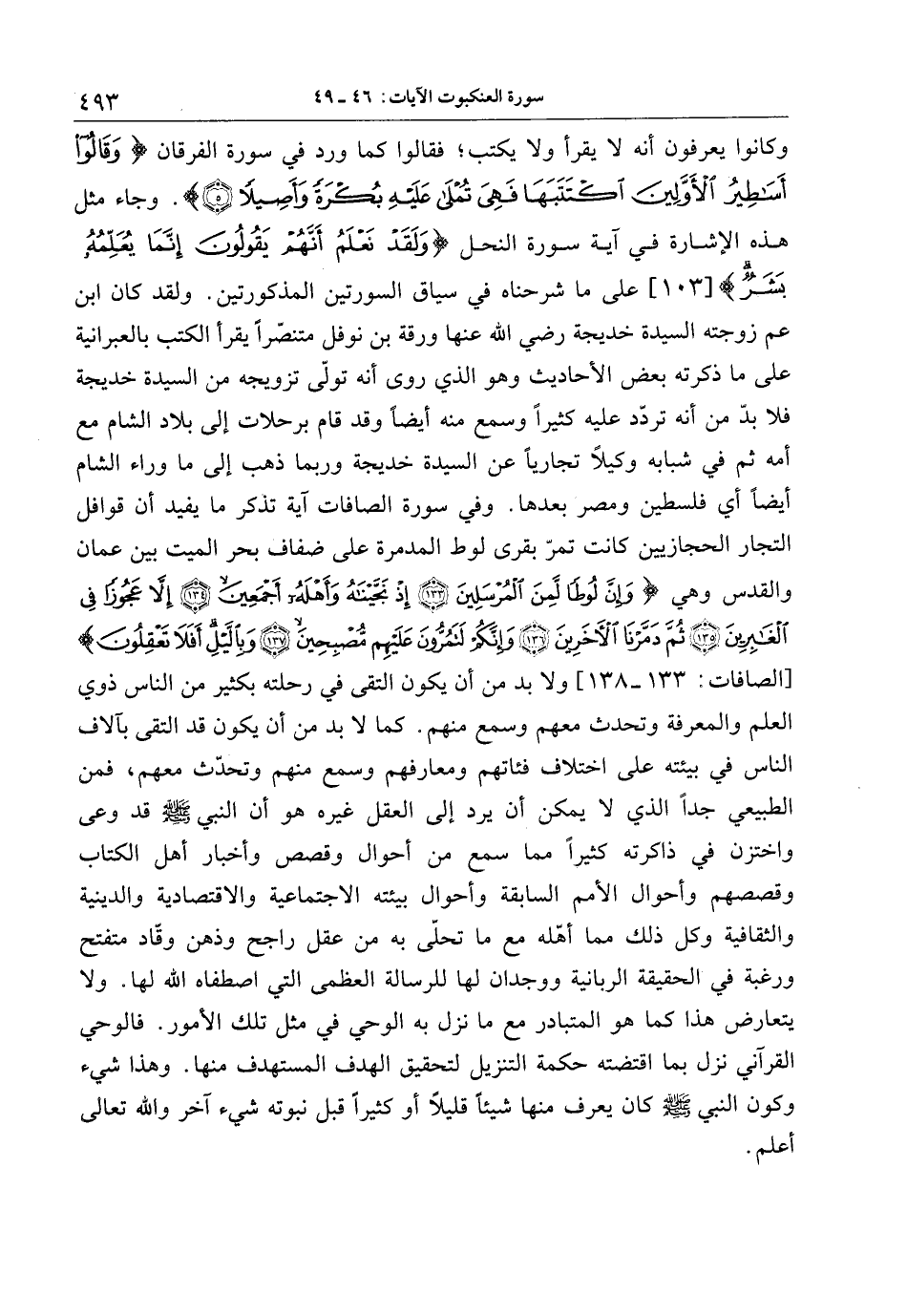 وكانوا يعرفون أنه لا يقرأ ولا يكتب فقالوا كما ورد في سورة الفرقان وَقالُوا أَساطِيرُ الْأَوَّلِينَ اكْتَتَبَها فَهِيَ تُمْلى عَلَيْهِ بُكْرَةً وَأَصِيلًا (5) . وجاء مثل هذه الإشارة في آية سورة النحل وَلَقَدْ نَعْلَمُ أَنَّهُمْ يَقُولُونَ إِنَّما يُعَلِّمُهُ بَشَرٌ [103] على ما شرحناه في سياق السورتين المذكورتين. ولقد كان ابن عم زوجته السيدة خديجة رضي الله عنها ورقة بن نوفل متنصّرا يقرأ الكتب بالعبرانية على ما ذكرته بعض الأحاديث وهو الذي روى أنه تولّى تزويجه من السيدة خديجة فلا بدّ من أنه تردّد عليه كثيرا وسمع منه أيضا وقد قام برحلات إلى بلاد الشام مع أمه ثم في شبابه وكيلا تجاريا عن السيدة خديجة وربما ذهب إلى ما وراء الشام أيضا أي فلسطين ومصر بعدها. وفي سورة الصافات آية تذكر ما يفيد أن قوافل التجار الحجازيين كانت تمرّ بقرى لوط المدمرة على ضفاف بحر الميت بين عمان والقدس وهي وَإِنَّ لُوطاً لَمِنَ الْمُرْسَلِينَ (133) إِذْ نَجَّيْناهُ وَأَهْلَهُ أَجْمَعِينَ (134) إِلَّا عَجُوزاً فِي الْغابِرِينَ (135) ثُمَّ دَمَّرْنَا الْآخَرِينَ (136) وَإِنَّكُمْ لَتَمُرُّونَ عَلَيْهِمْ مُصْبِحِينَ (137) وَبِاللَّيْلِ أَفَلا تَعْقِلُونَ [الصافات: 133- 138] ولا بد من أن يكون التقى في رحلته بكثير من الناس ذوي العلم والمعرفة وتحدث معهم وسمع منهم. كما لا بد من أن يكون قد التقى بآلاف الناس في بيئته على اختلاف فئاتهم ومعارفهم وسمع منهم وتحدّث معهم، فمن الطبيعي جدا الذي لا يمكن أن يرد إلى العقل غيره هو أن النبي صلى الله عليه وسلم قد وعى واختزن في ذاكرته كثيرا مما سمع من أحوال وقصص وأخبار أهل الكتاب وقصصهم وأحوال الأمم السابقة وأحوال بيئته الاجتماعية والاقتصادية والدينية والثقافية وكل ذلك مما أهّله مع ما تحلّى به من عقل راجح وذهن وقّاد متفتح ورغبة في الحقيقة الربانية ووجدان لها للرسالة العظمى التي اصطفاه الله لها. ولا يتعارض هذا كما هو المتبادر مع ما نزل به الوحي في مثل تلك الأمور. فالوحي القرآني نزل بما اقتضته حكمة التنزيل لتحقيق الهدف المستهدف منها. وهذا شيء وكون النبي صلى الله عليه وسلم كان يعرف منها شيئا قليلا أو كثيرا قبل نبوته شيء آخر والله تعالى أعلم.