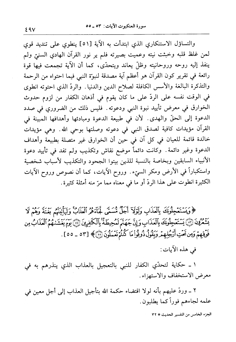والتساؤل الاستنكاري الذي ابتدأت به الآية [51] ينطوي على تنديد قوي لمن غلظ قلبه وخبثت نيته وعميت بصيرته فلم ير نور القرآن الهادي السنيّ ولم ينفذ إليه روحه وروحانيته وظلّ يعاند ويتحدّى، كما أن الآية تجمعت فيها قوة رائعة في تقرير كون القرآن هو أعظم آية مصدقة لنبوّة النبي فيما احتواه من الرحمة والتذكرة البالغة والأسس الكافلة لصلاح الدين والدنيا. والردّ الذي احتوته انطوى في الوقت نفسه على الردّ على ما كان يقوم في أذهان الكفار من لزوم حدوث الخوارق في معرض تأييد نبوة النبي ودعوته. فليس ذلك من الضروري في صدد الدعوة إلى الحقّ والهدى. لأن في طبيعة الدعوة ومبادئها وأهدافها المبينة في القرآن مؤيدات كافية لصدق النبي في دعوته وصلتها بوحي الله. وهي مؤيدات خالدة قائمة للعيان في كل آن في حين أن الخوارق غير متصلة بطبيعة وأهداف الدعوة وغير دائمة. وكانت دائما موضع نقاش وتكذيب ولم تفد في تأييد دعوة الأنبياء السابقين وبخاصة بالنسبة للذين بيتوا الجحود والتكذيب لأسباب شخصية واستكبارا في الأرض ومكر السيّء. وروح الآيات، كما أن نصوص وروح الآيات الكثيرة انطوت على هذا الردّ أو ما في معناه مما مرّ منه أمثلة كثيرة.