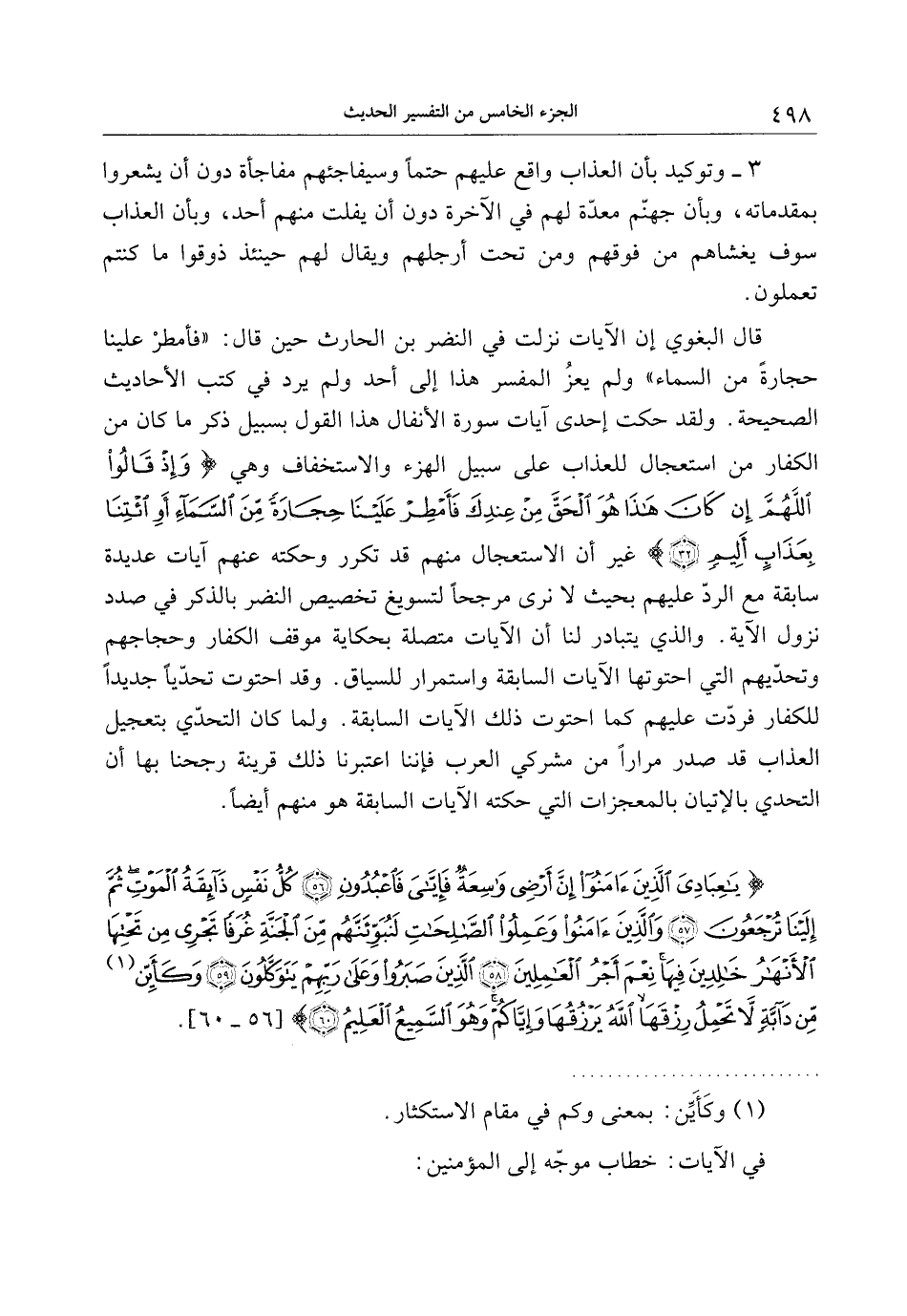 (32) غير أن الاستعجال منهم قد تكرر وحكته عنهم آيات عديدة سابقة مع الردّ عليهم بحيث لا نرى مرجحا لتسويغ تخصيص النضر بالذكر في صدد نزول الآية. والذي يتبادر لنا أن الآيات متصلة بحكاية موقف الكفار وحجاجهم وتحدّيهم التي احتوتها الآيات السابقة واستمرار للسياق. وقد احتوت تحدّيا جديدا للكفار فردّت عليهم كما احتوت ذلك الآيات السابقة. ولما كان التحدّي بتعجيل العذاب قد صدر مرارا من مشركي العرب فإننا اعتبرنا ذلك قرينة رجحنا بها أن التحدي بالإتيان بالمعجزات التي حكته الآيات السابقة هو منهم أيضا.