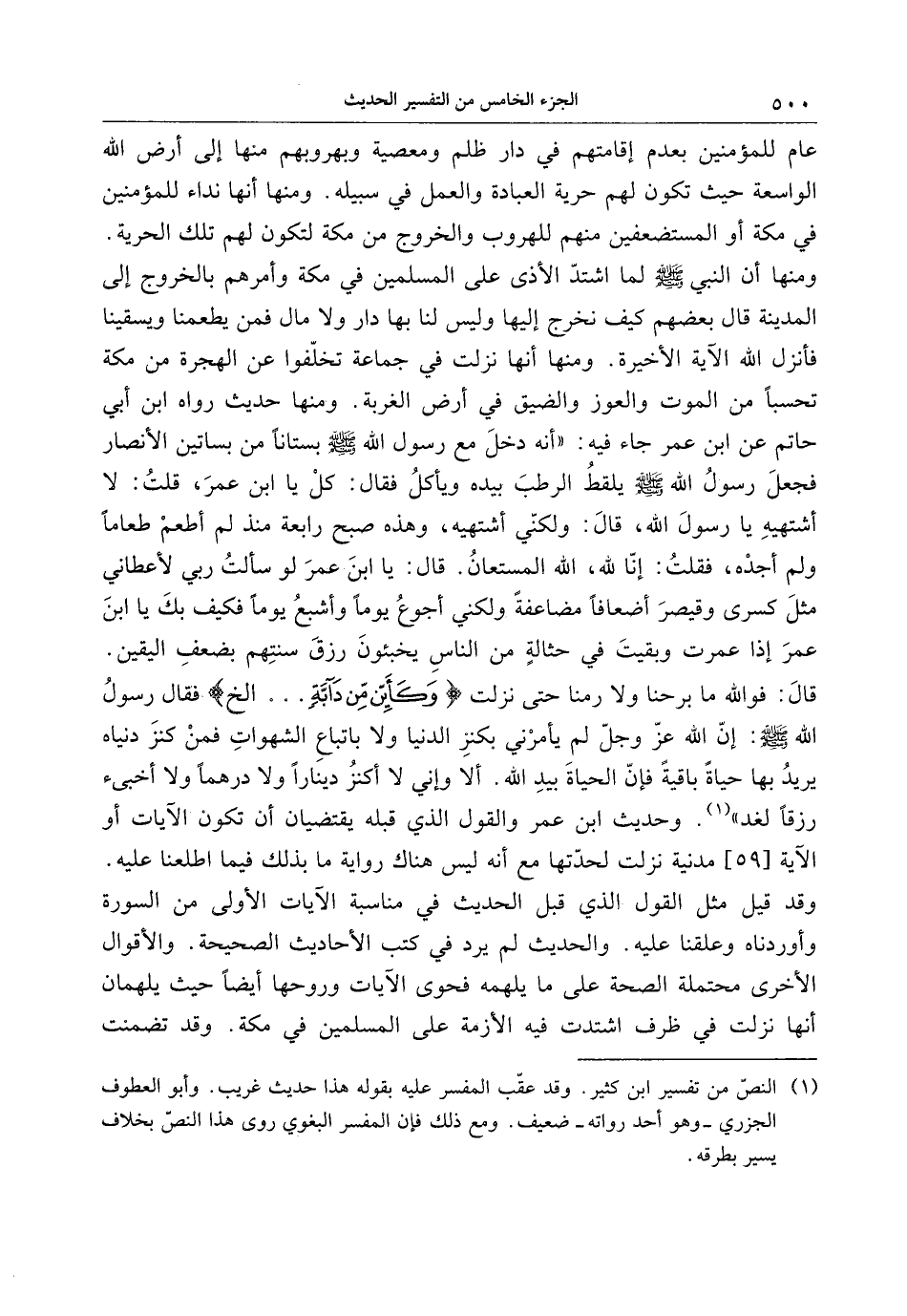 قال: فو الله ما برحنا ولا رمنا حتى نزلت وَكَأَيِّنْ مِنْ دَابَّةٍ ... إلخ فقال رسول الله صلى الله عليه وسلم: إنّ الله عزّ وجلّ لم يأمرني بكنز الدنيا ولا باتباع الشهوات فمن كنز دنياه يريد بها حياة باقية فإنّ الحياة بيد الله. ألا وإني لا أكنز دينارا ولا درهما ولا أخبئ رزقا لغد» «1» . وحديث ابن عمر والقول الذي قبله يقتضيان أن تكون الآيات أو الآية [59] مدنية نزلت لحدّتها مع أنه ليس هناك رواية ما بذلك فيما اطلعنا عليه.