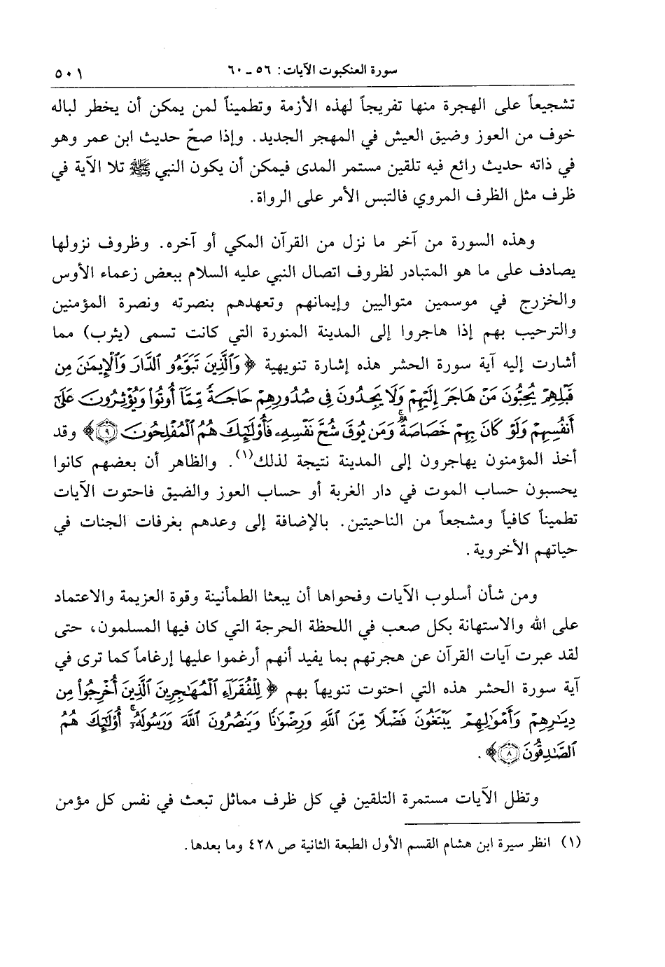 وهذه السورة من آخر ما نزل من القرآن المكي أو آخره. وظروف نزولها يصادف على ما هو المتبادر لظروف اتصال النبي عليه السلام ببعض زعماء الأوس والخزرج في موسمين متواليين وإيمانهم وتعهدهم بنصرته ونصرة المؤمنين والترحيب بهم إذا هاجروا إلى المدينة المنورة التي كانت تسمى (يثرب) مما أشارت إليه آية سورة الحشر هذه إشارة تنويهية وَالَّذِينَ تَبَوَّؤُا الدَّارَ وَالْإِيمانَ مِنْ قَبْلِهِمْ يُحِبُّونَ مَنْ هاجَرَ إِلَيْهِمْ وَلا يَجِدُونَ فِي صُدُورِهِمْ حاجَةً مِمَّا أُوتُوا وَيُؤْثِرُونَ عَلى أَنْفُسِهِمْ وَلَوْ كانَ بِهِمْ خَصاصَةٌ وَمَنْ يُوقَ شُحَّ نَفْسِهِ فَأُولئِكَ هُمُ الْمُفْلِحُونَ (9) وقد أخذ المؤمنون يهاجرون إلى المدينة نتيجة لذلك «1» . والظاهر أن بعضهم كانوا يحسبون حساب الموت في دار الغربة أو حساب العوز والضيق فاحتوت الآيات تطمينا كافيا ومشجعا من الناحيتين. بالإضافة إلى وعدهم بغرفات الجنات في حياتهم الأخروية.