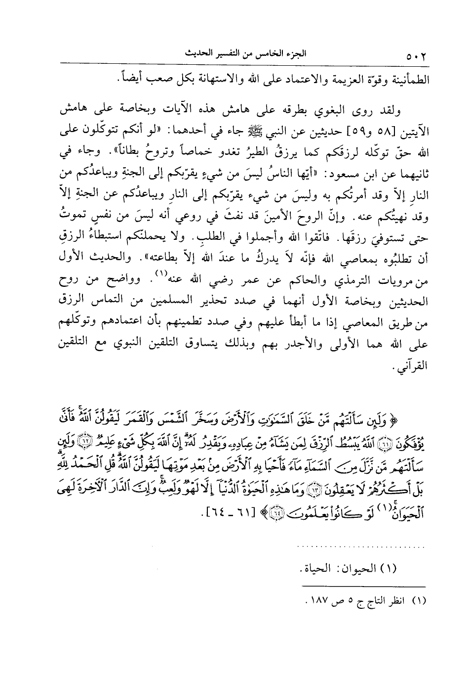 ولقد روى البغوي بطرقه على هامش هذه الآيات وبخاصة على هامش الآيتين [58 و 59] حديثين عن النبي صلى الله عليه وسلم جاء في أحدهما: «لو أنكم تتوكّلون على الله حقّ توكّله لرزقكم كما يرزق الطير تغدو خماصا وتروح بطانا» . وجاء في ثانيهما عن ابن مسعود: «أيّها الناس ليس من شيء يقرّبكم إلى الجنّة ويباعدكم من النار إلّا وقد أمرتكم به وليس من شيء يقرّبكم إلى النار ويباعدكم عن الجنة إلّا وقد نهيتكم عنه. وإنّ الروح الأمين قد نفث في روعي أنه ليس من نفس تموت حتى تستوفي رزقها. فاتّقوا الله وأجملوا في الطلب. ولا يحملنّكم استبطاء الرزق أن تطلبوه بمعاصي الله فإنّه لا يدرك ما عند الله إلّا بطاعته» . والحديث الأول من مرويات الترمذي والحاكم عن عمر رضي الله عنه «1» . وواضح من روح الحديثين وبخاصة الأول أنهما في صدد تحذير المسلمين من التماس الرزق من طريق المعاصي إذا ما أبطأ عليهم وفي صدد تطمينهم بأن اعتمادهم وتوكّلهم على الله هما الأولى والأجدر بهم وبذلك يتساوق التلقين النبوي مع التلقين القرآني.